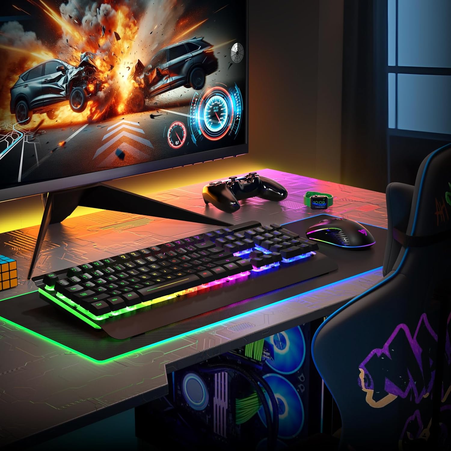 RisoPhy Wireless Gaming Keyboard and Mouse, Metal Plate, 7 Color Backlight, Rechargeable 3200mAh Battery, Palm Rest, Sleep Mode, Illuminated Keyboard + Mice