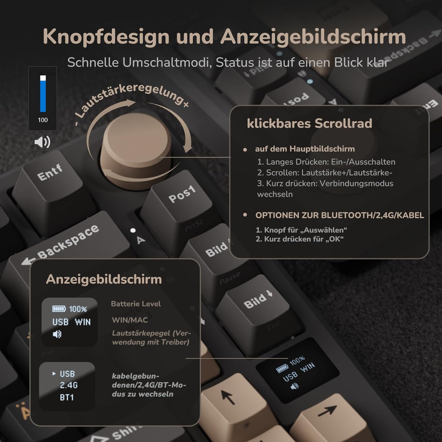 Mit multifunktionalem OLED-Smart-Display und Taste: Die mechanische Tastatur M75 verfügt über einen integrierten OLED-Bildschirm und eine Taste, sodass diese kabellose mechanische Tastatur Spaß macht! Anzeigefunktion: Akkustand, WIN/MAC, kabelgebundener/2,4G/Bluetooth-Modus, Lautstärke. Tastenfunktion: Gerät wechseln, Lautstärke einstellen, Verbindungsmodus wechseln.