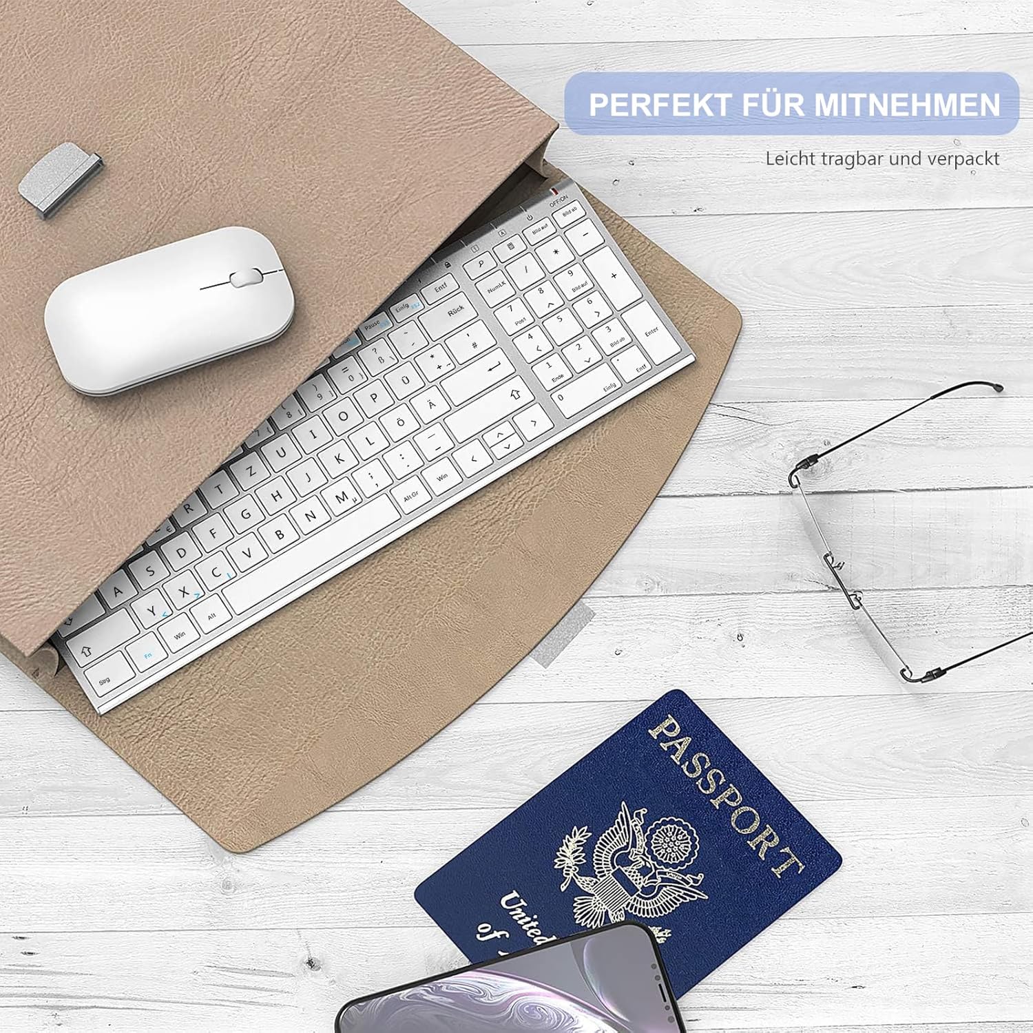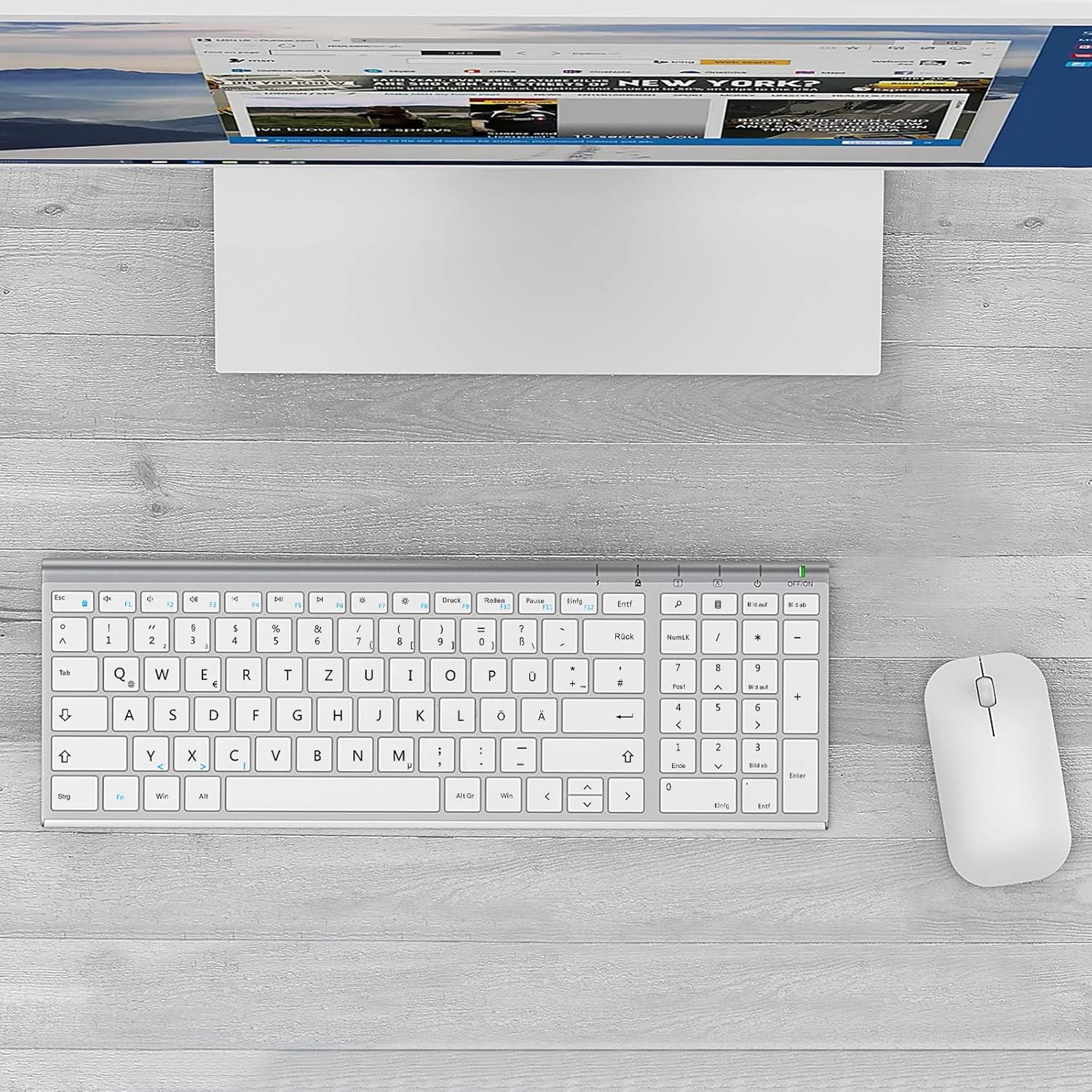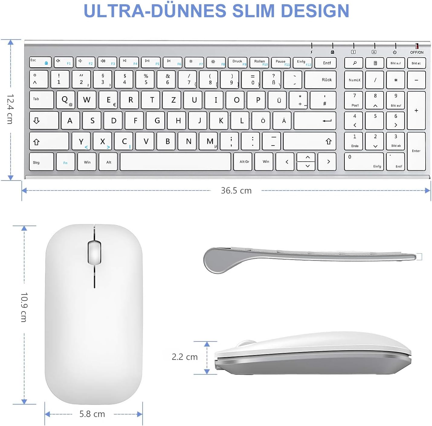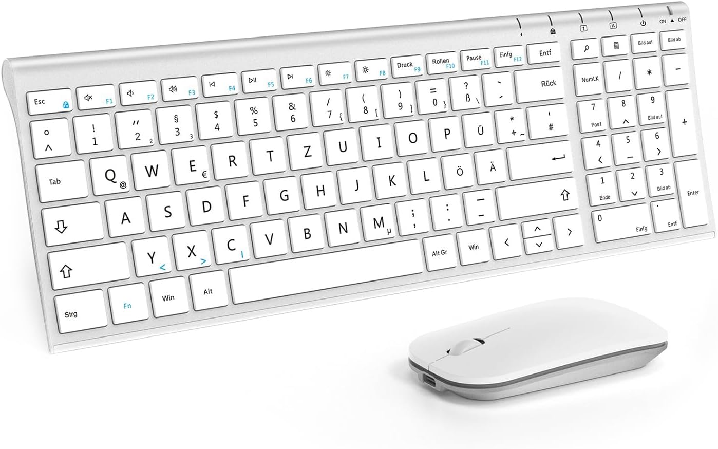 seenda WGJP-031B Wireless Keyboard Mouse Set, Rechargeable Small Wireless Keyboard with Mouse, Metal Keyboard for PC/Laptop/Smart TV, Quiet Click & QWERTZ Layout, White & Silver