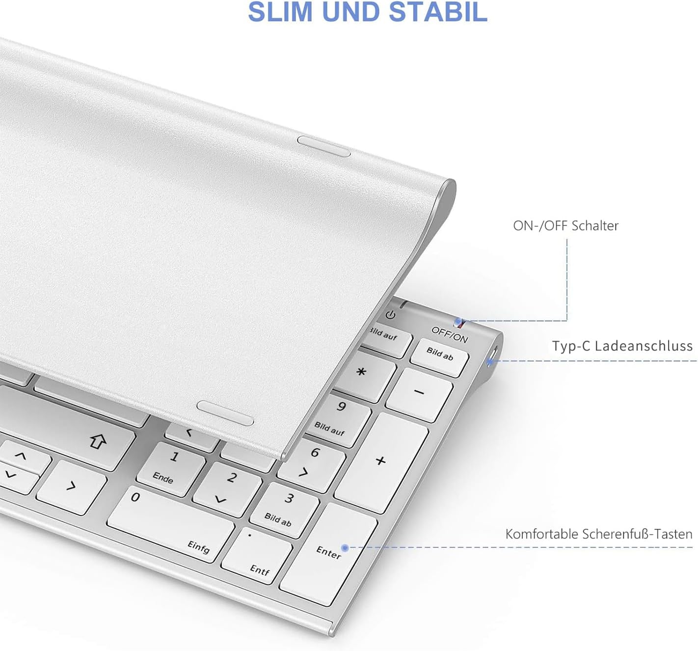 Metalltastatur – Die kabellose Tastatur besteht aus einer robusten Metallbasis und hochwertigen ABS-Tasten, ultradünn, aber langlebig. Dank der Scherenfußstruktur reagieren Tastatureingaben schnell und leise. Plug-and-Play, keine Aussetzer, keine Verzögerung