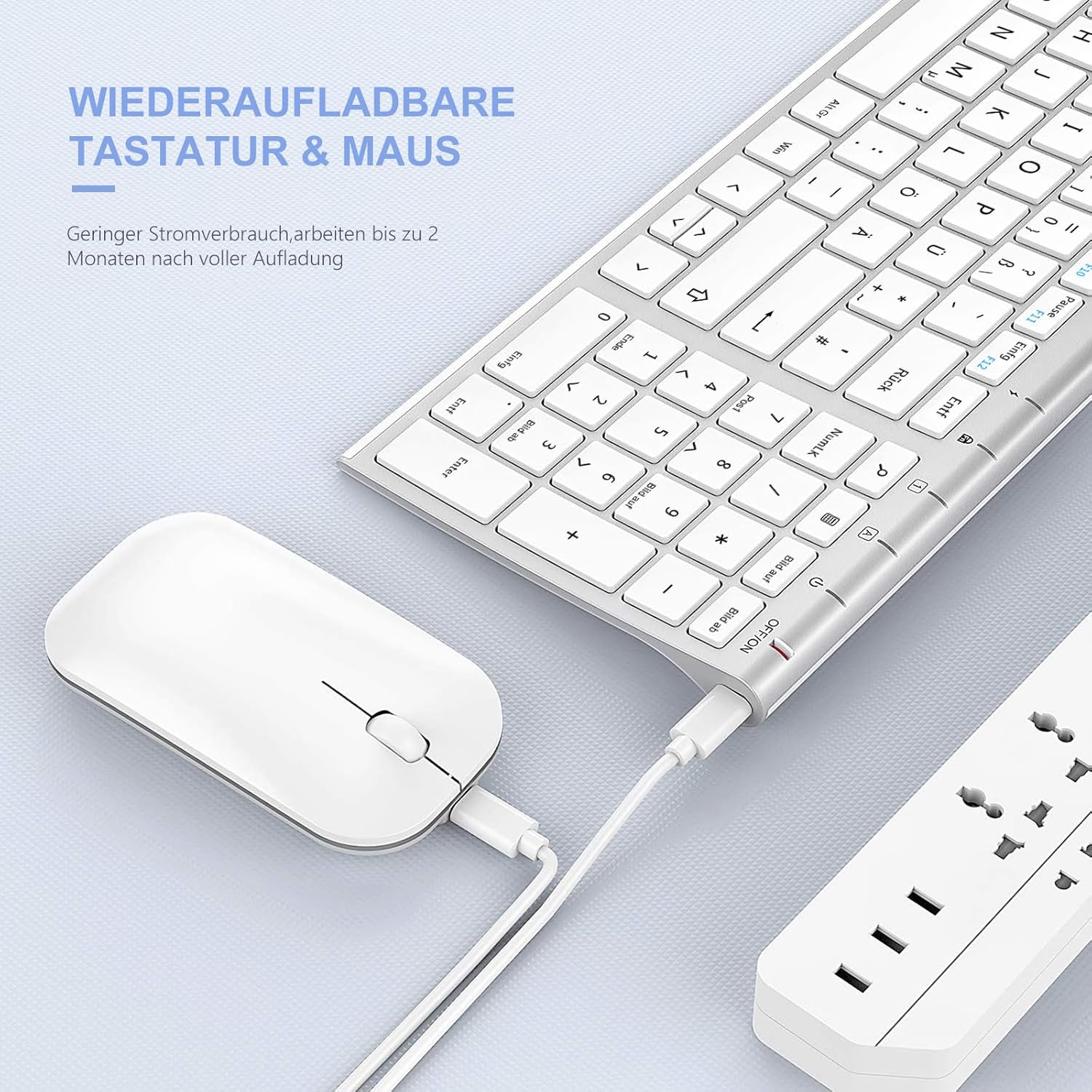 Wiederaufladbare Tastatur und Maus – Die kabellose Tastatur und Maus verfügen über einen integrierten 280-mAh-Akku, der über das mitgelieferte Micro-USB-Ladekabel zwei Stunden lang aufgeladen und bis zu 60 Tage lang genutzt werden kann – bei extrem langer Akkulaufzeit. Die intelligente Auto-Sleep-Funktion hilft Ihnen zudem, Energie zu sparen. Schalten Sie das Gerät aus, wenn Sie es nicht verwenden – optimieren Sie die Akkulaufzeit