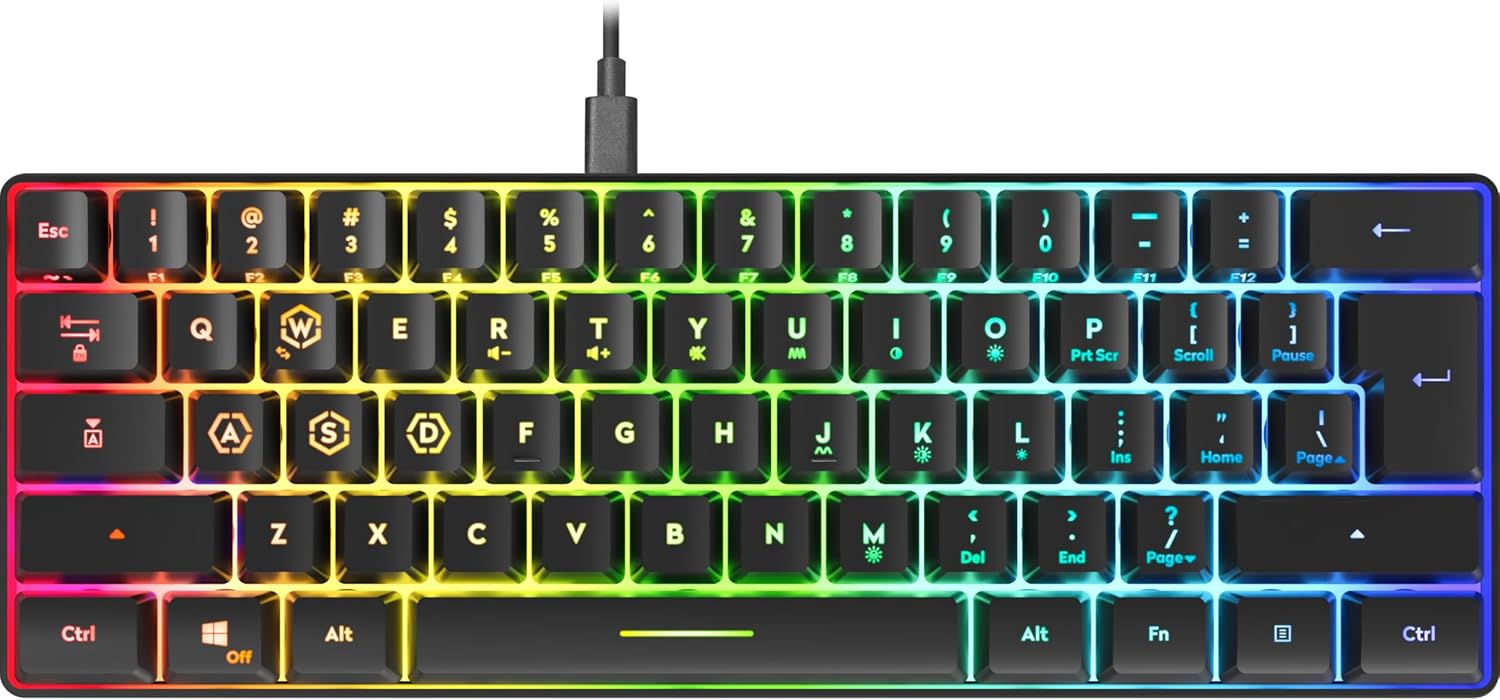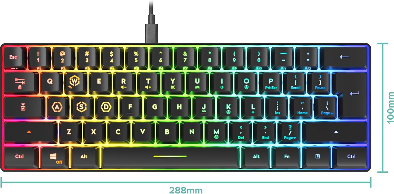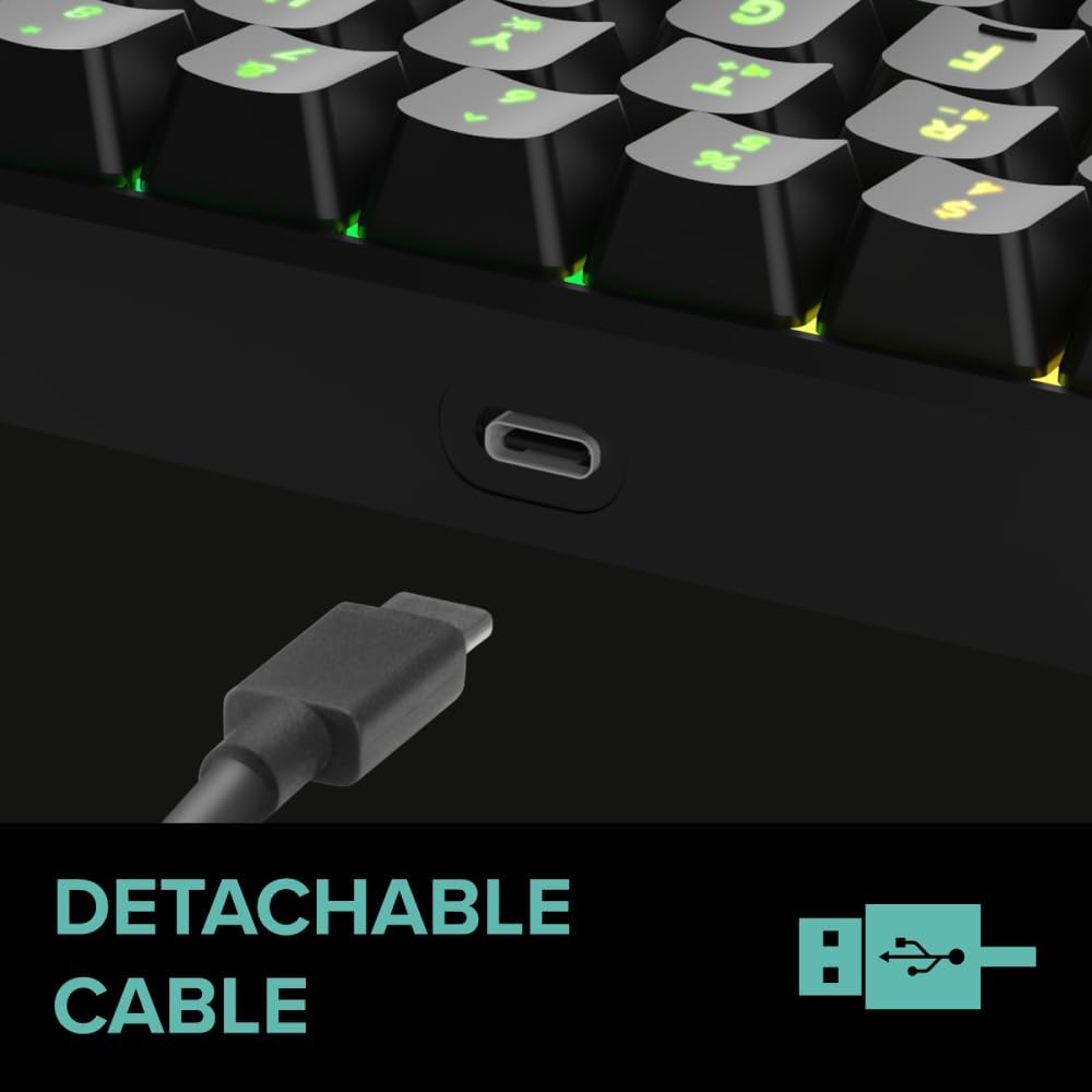 Die Gaming-Tastatur LETOS RGB 60 % vereint stilvolles Design mit hoher Funktionalität. Die umfangreiche RGB-Beleuchtung bietet sowohl monochrome als auch mehrfarbige Modi, die nach Wunsch ausgewählt und auch ausgeschaltet werden können. Die Tastatur zeichnet sich durch ihre kompakte Größe von 60 % aus und ist mit einem 1,5 Meter langen, abnehmbaren USB-C-auf-USB-A-Kabel ausgestattet. Eine Funktionserweiterung ist über FN-Tastenkombinationen möglich. Die 25-Tasten-Anti-Ghosting-Technologie ermöglicht jederzeit präzise Eingaben. Mit einer USB-Abfragerate von 1.000 Hz ist eine schnelle und zuverlässige Reaktionsfähigkeit gewährleistet. Die verstellbare Höhenverstellung und die rutschfesten Füße sorgen für optimalen Komfort.