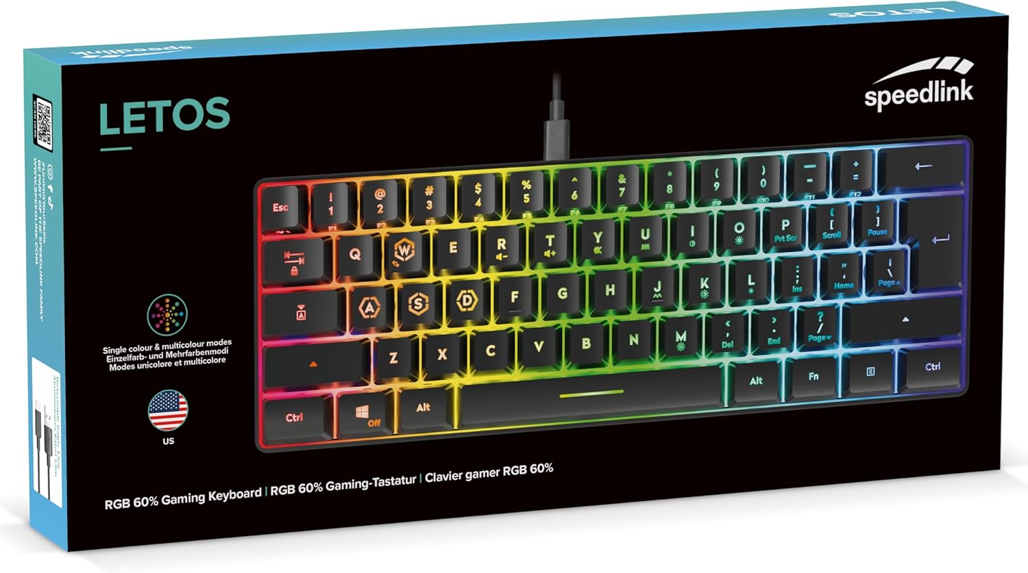 Speedlink Letos – RGB Gaming Keyboard 60%, Wired, USB-C Cable Removable, Anti-Ghosting, Backlight Various Lighting Modes, US Layout English QWERTY, Black