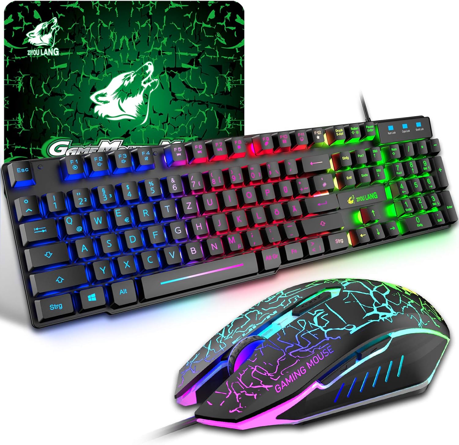 T13 Gaming Keyboard and Mouse Set, QWERTZ German Layout, Rainbow LED Backlight, Ergonomic Keyboard, 6 Buttons, 2400 DPI Mouse, USB Wired, Compatible with PS4 XBox