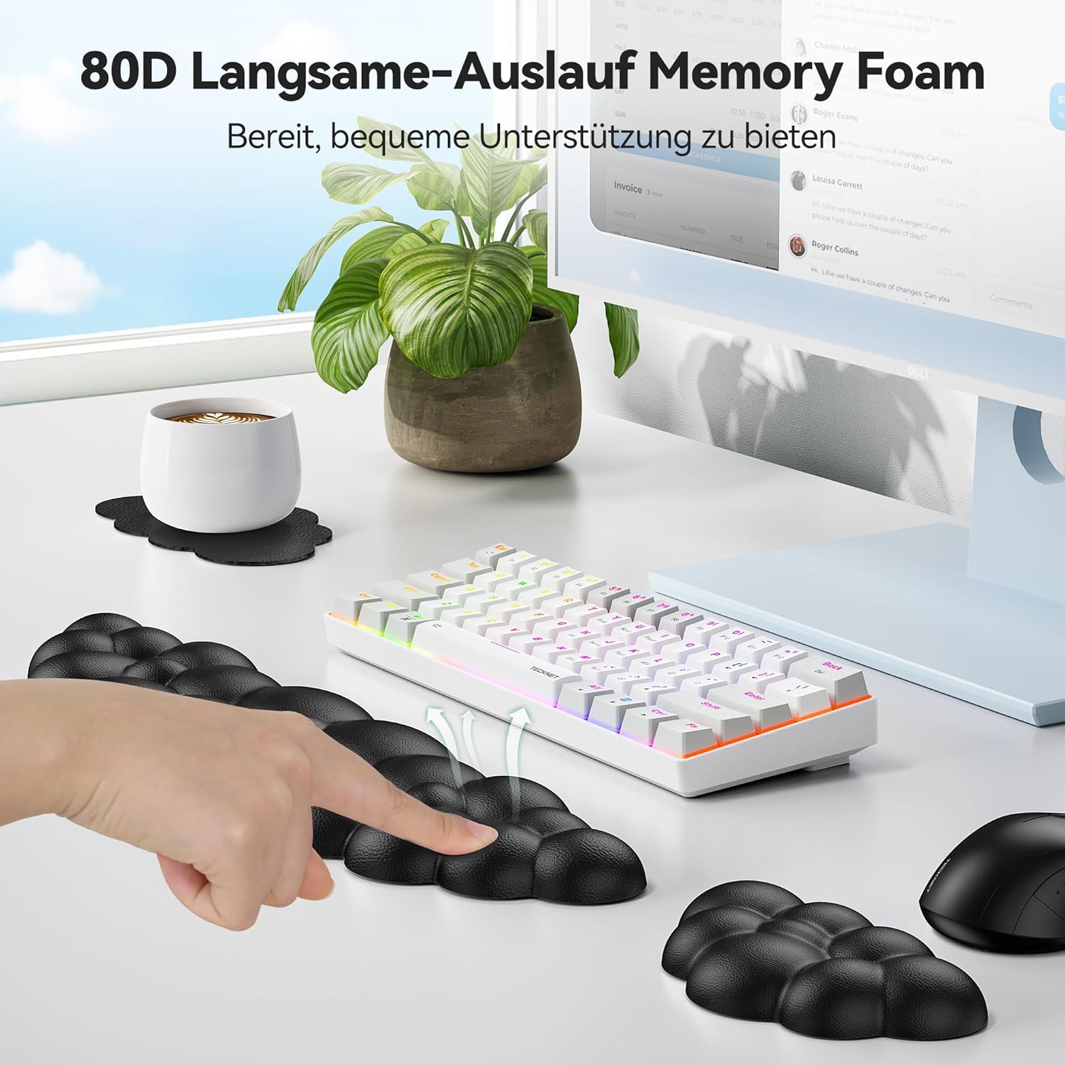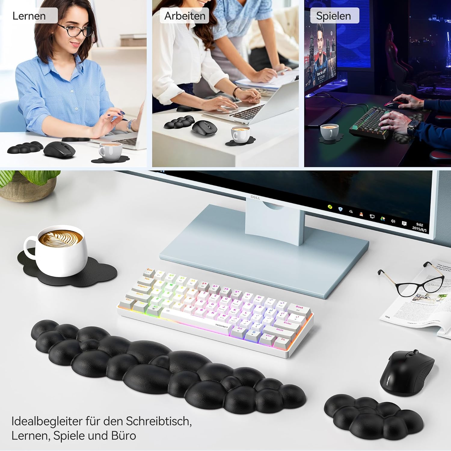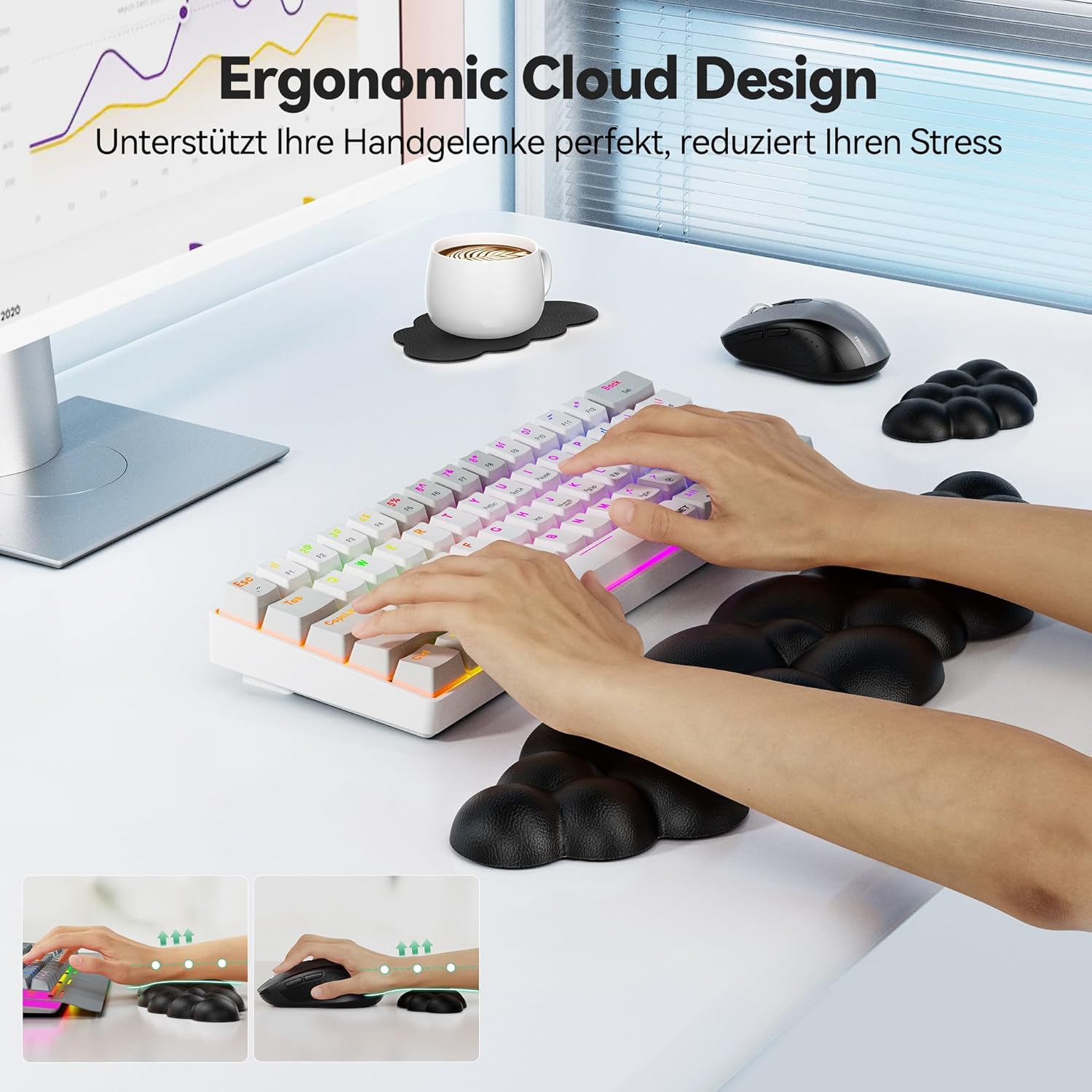 Wolkenweicher Komfort: Hochwertiger 63D-Memory-Schaum mit hoher Dichte und weichem, atmungsaktivem Ledergewebe, passt sich der Haut an und ist super bequem. Dieses niedliche und weiche Wolken-Tastaturpad mit Handgelenkstütze ist langlebig und perfekt für Sie geformt. Es ist ein perfekter Desktop-Begleiter für Spiele und Büro