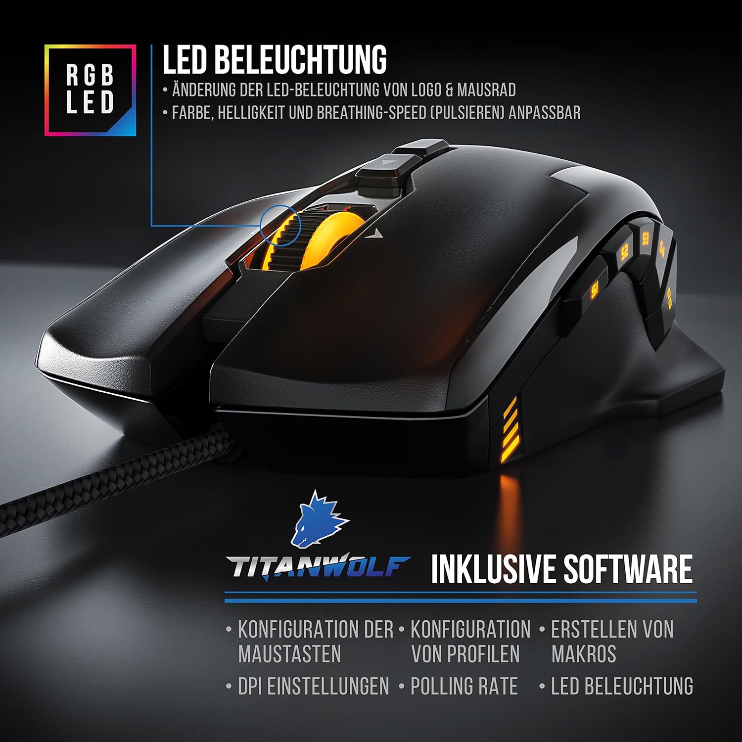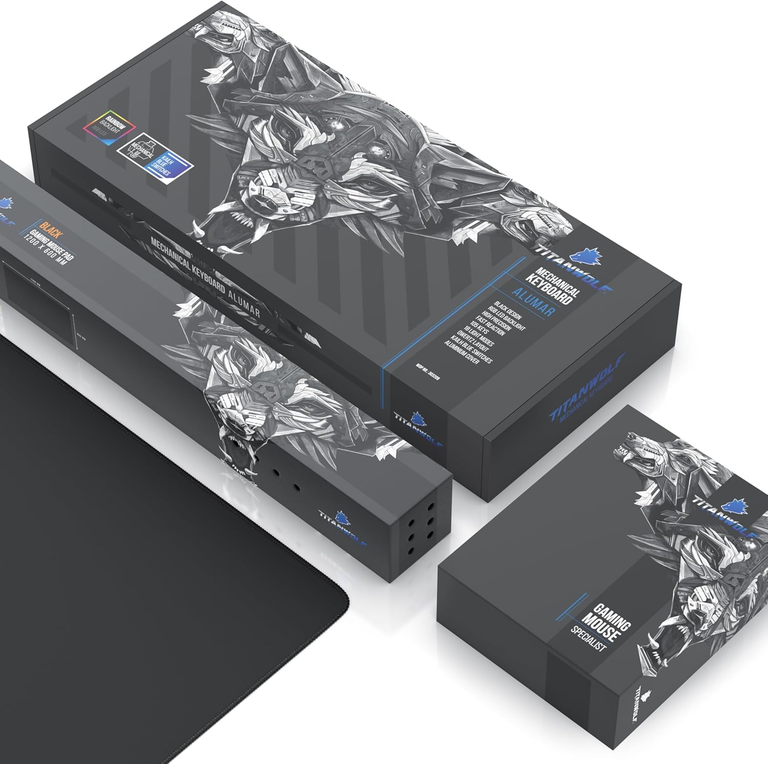 Titanwolf Gaming Set – Mechanical Keyboard + Gaming Mouse 10800 dpi + 1200 x 600 XXXL Mouse Pad Plus Size – Mechanical Keyboard – Anti-Ghosting – LED Backlight – 19 Light Modes – Macro Mode
