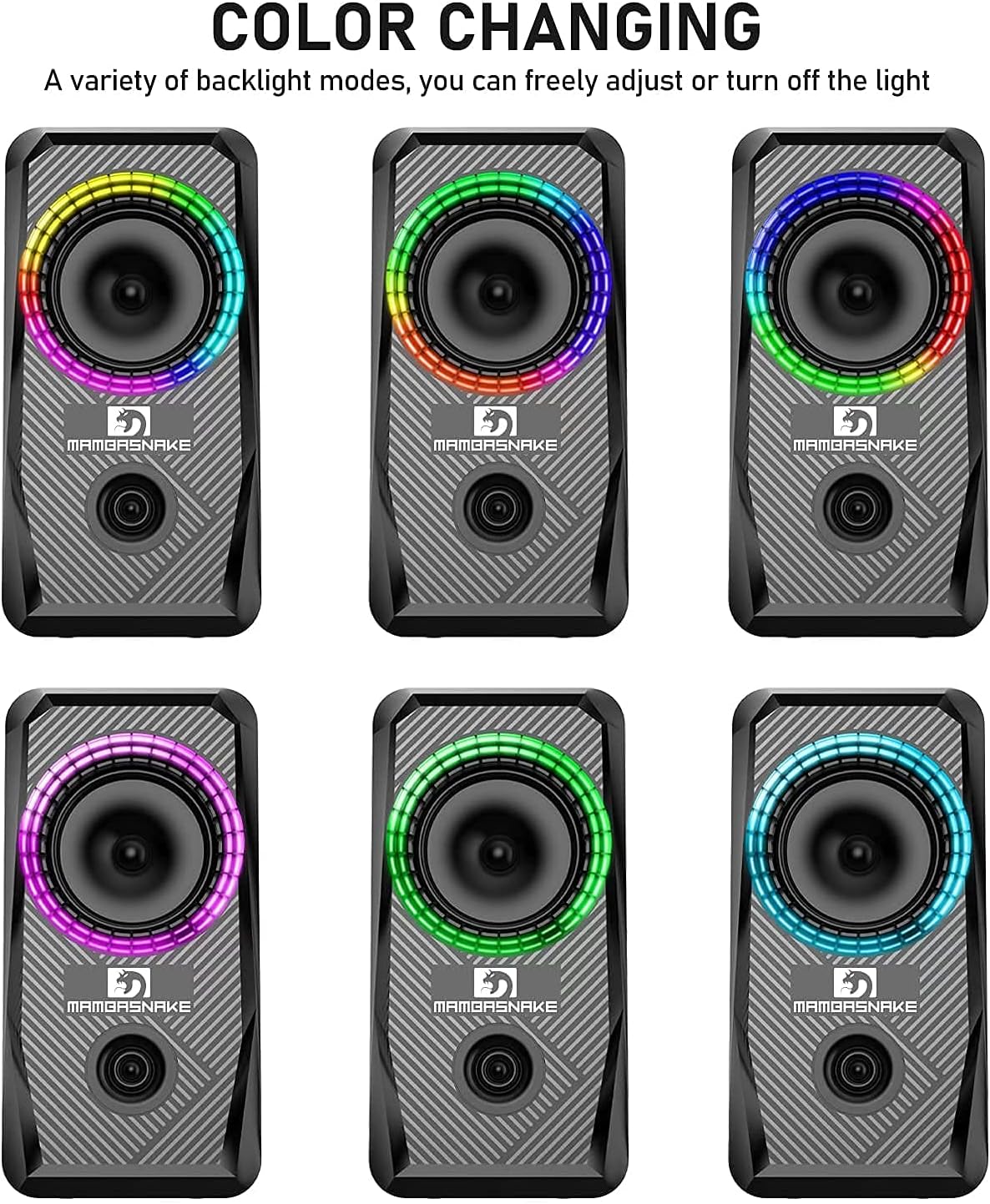 Leichter Gaming-Lautsprecher: Dieser Mini-Gaming-Lautsprecher verfügt über einen integrierten 2 x 5-W-Lautsprechertreiber zur Verbesserung des Stereoeffekts für satten und hochwertigen Klang, Multi-Chroma-Hintergrundbeleuchtungseffekt, 3,5-mm-Audioschnittstelle kann an das Gerät angeschlossen werden, das diesen Schnittstellentyp unterstützt, einfach anzuschließen und zu spielen, kleine Größe, langer USB-Netzstecker mit Lautstärkeregler und Hintergrundbeleuchtungsgehäuse. .