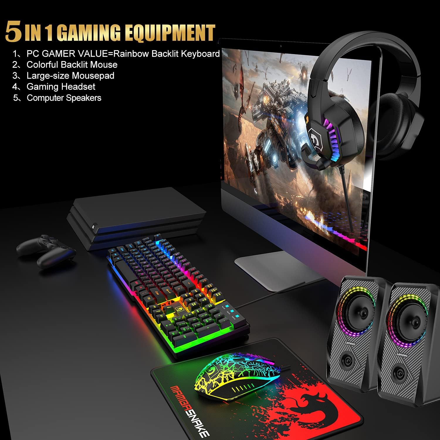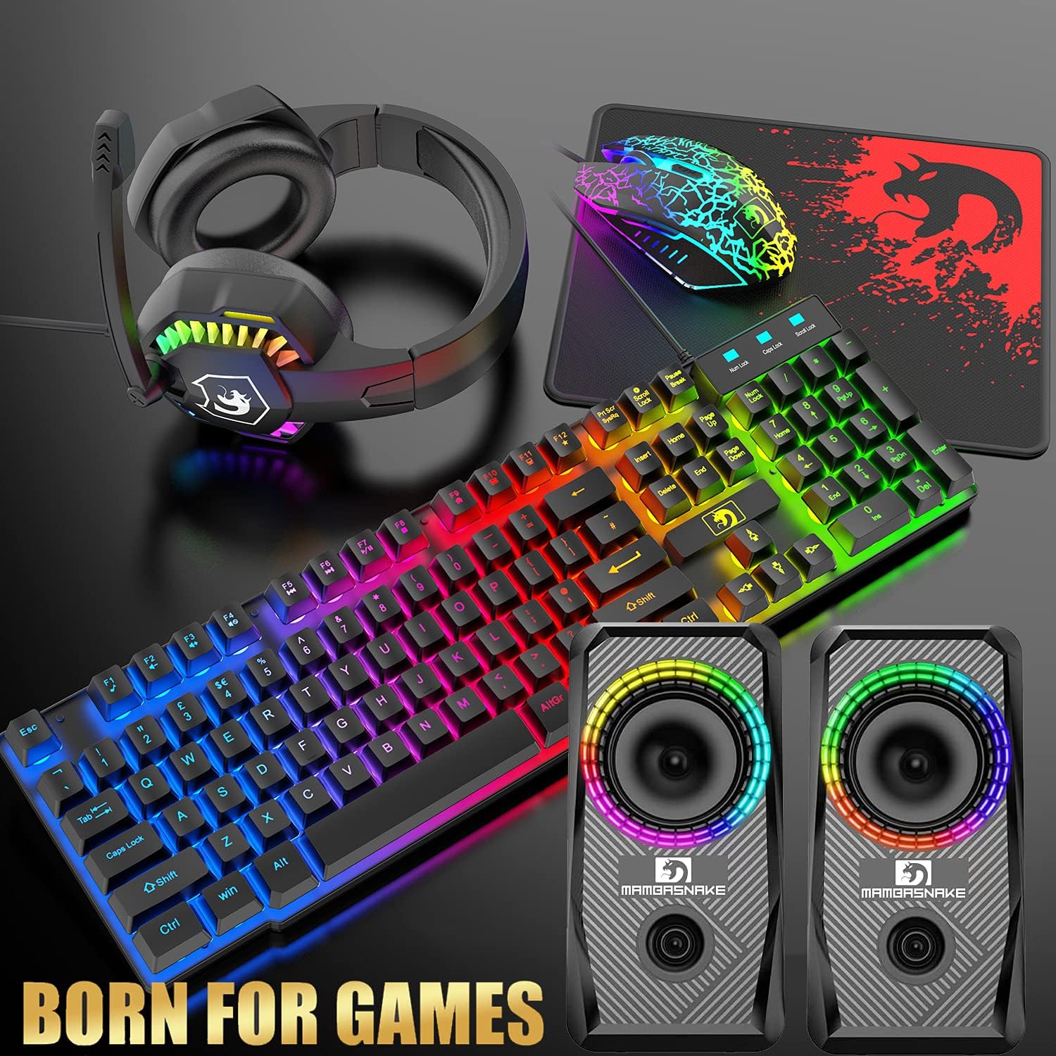 UK Layout Wired 104 Key Gaming Keyboard Mouse Headphone Speaker 5 in 1 Combo Multi RGB Backlight Adjustable 2400DPI Mouse Great Mousepad Waterproof