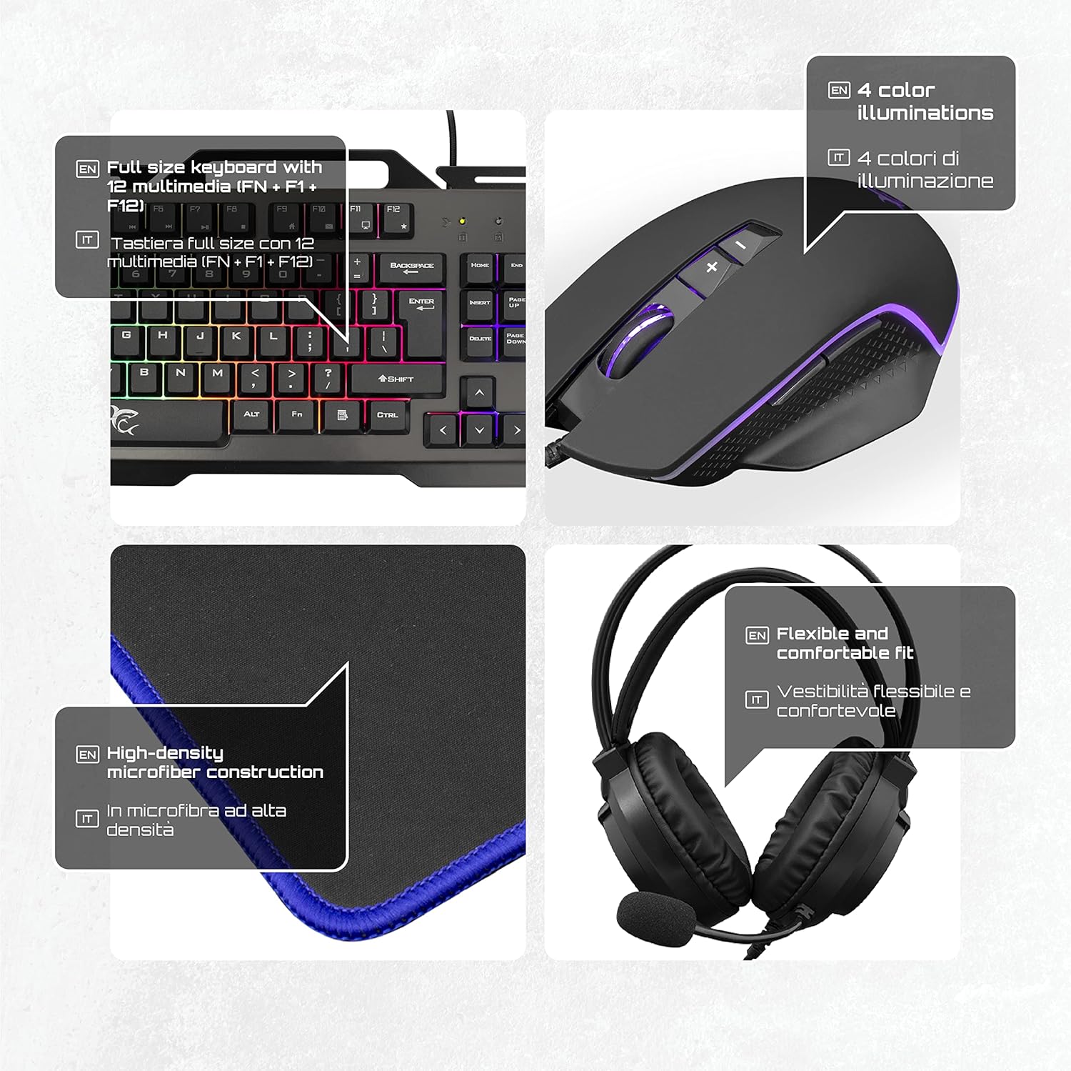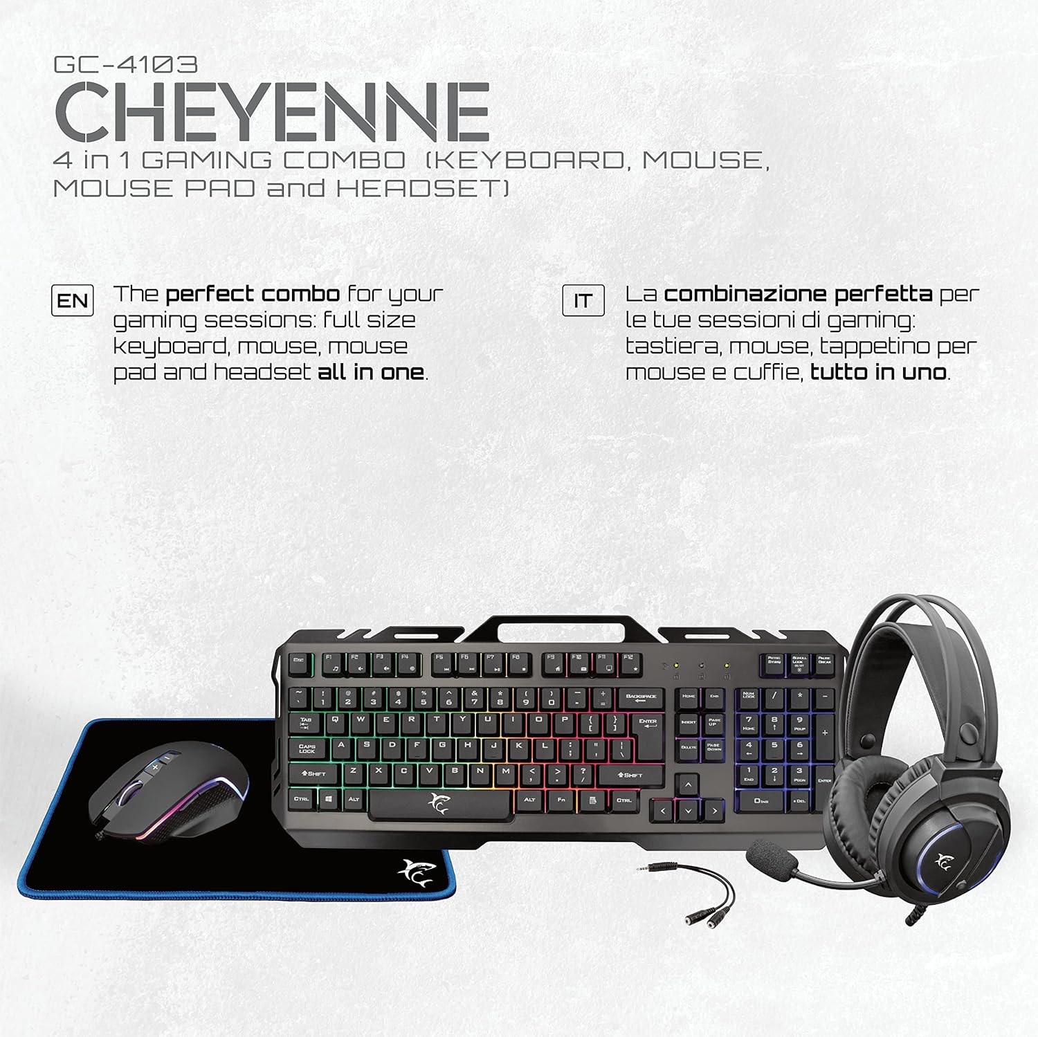 White Shark, Cheyenne Combo 4-in-1 Gaming Set Consisting of Mouse with LED Lighting 4 Colours, Keyboard with Anti-Ghosting Function, Gaming Headset with Microphone and Mouse Mat, Black