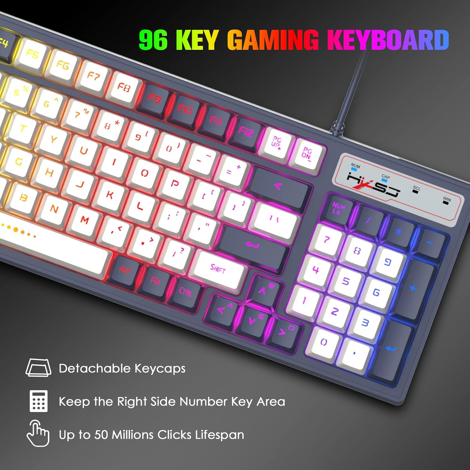 Tastaturlayout: 96 Tastaturtyp: MembrantastaturVerbindungsmethode: Kabelgebundene USB 2.0-VerbindungAnti-Ghosting mit 26 TastenLebensdauer der Tasten: Über 50 Millionen Mal2 Extra verstellbare FußstützeEinstellung der Hintergrundbeleuchtung: Drücken Sie FN+1/2/3/4/5/6/7, um die Hintergrundbeleuchtungseffekte umzuschalten (bis zu 7 Arten von Effekten, 8 Arten von Farben), drücken Sie FN+/→, um die Geschwindigkeit der Hintergrundbeleuchtung zu verlangsamen/zu beschleunigen (4 Stufen), drücken Sie FN+-/–, um Um die Helligkeit der Hintergrundbeleuchtung zu erhöhen/verringern (3 Stufen), drücken Sie FN+. PGDN zu PGDN zum Ein-/Ausschalten der HintergrundbeleuchtungFN-Tastenkombination: FN+F1=Musik, FN+F2=Lautstärke-, FN+F3=Lautstärke+, FN+F4=Stumm, FN+F5=Vorheriges Lied, FN+F6=Nächstes Lied, FN+F7=Pause/Wiedergabe, FN+F8=Stopp, FN+F9=E-Mail, FN+F10. =homepage=homepage, FN+F11= Arbeitsplatz, FN+F12= Rechner, Win+L=Win und APP sperren/entsperren, FN+W= Funktion von W/A/S/D auf Pfeiltaste umstellen (zum Wiederherstellen erneut FN+W drücken)
