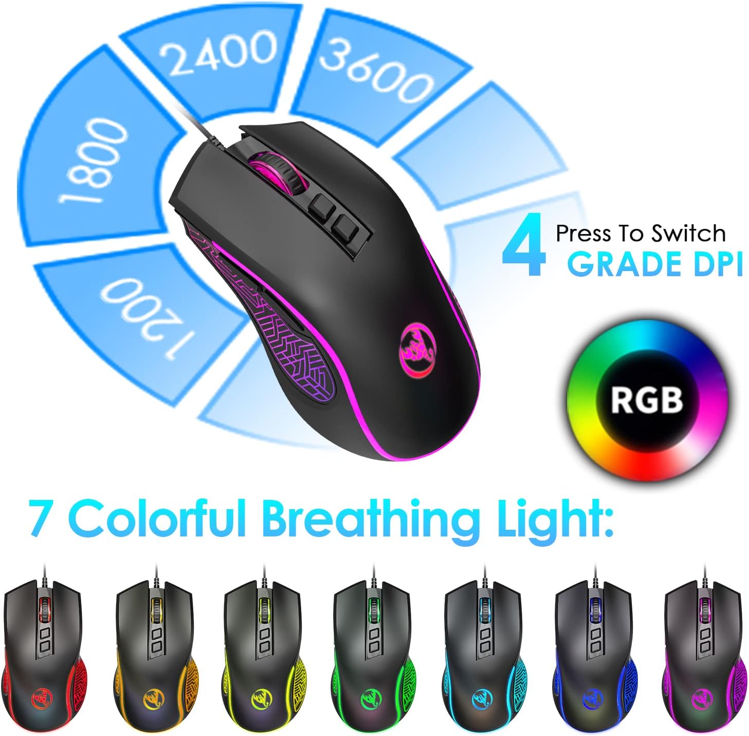 4. RGB-Gaming-Maus Diese kabelgebundene Gaming-Maus ist mit einer ergonomischen Struktur, einer coolen 7-Farben-RGB-Hintergrundbeleuchtung und 4 einstellbaren DPI-Stufen (1200/1800/2400/3600) ausgestattet, um die Bewegungsgeschwindigkeit freier und einfacher zu steuern. Das symmetrische Design sorgt für eine lange Lebensdauer ohne Ermüdung und präzises Klicken mit guter Empfindlichkeit und bis zu 10 Millionen Mal Lebensdauer, erstaunliche Hintergrundbeleuchtung. Bringen Sie mehr Spaß beim Spielen
