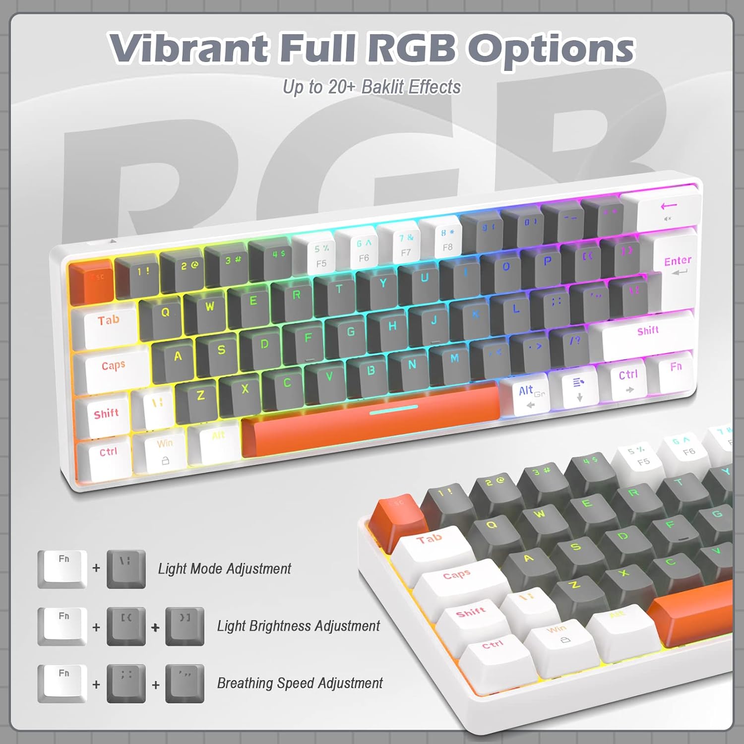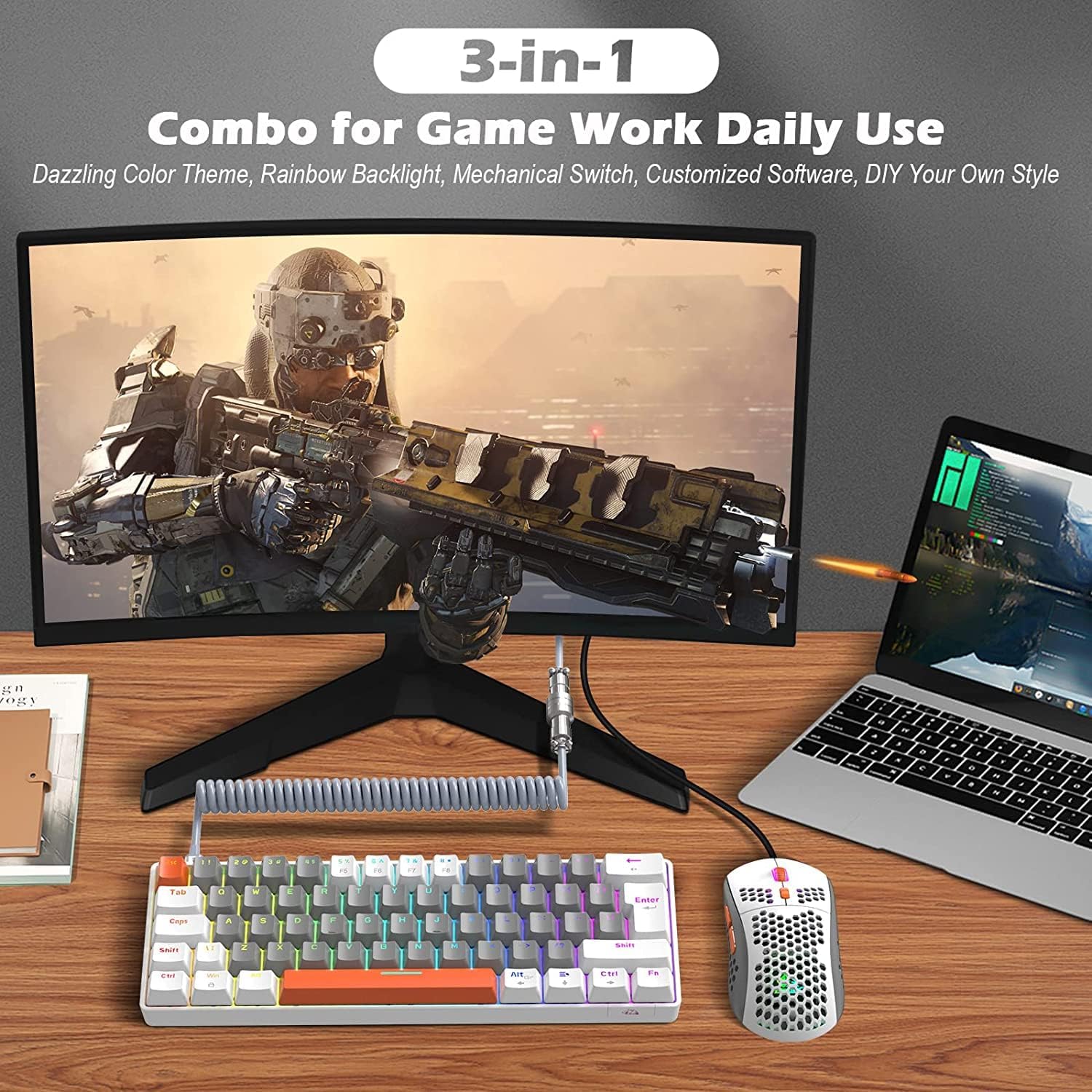 ZIYOU LANG Wired Gaming Keyboard and Mouse Combo with Spiral USB-C Cable T60 Pro – Compact 60% UK Layout (QWERTY) Mechanical Keyboard Linear Red Switch, 6400DPI Ultra-Light RGB Mice for PC/Mac – Bee