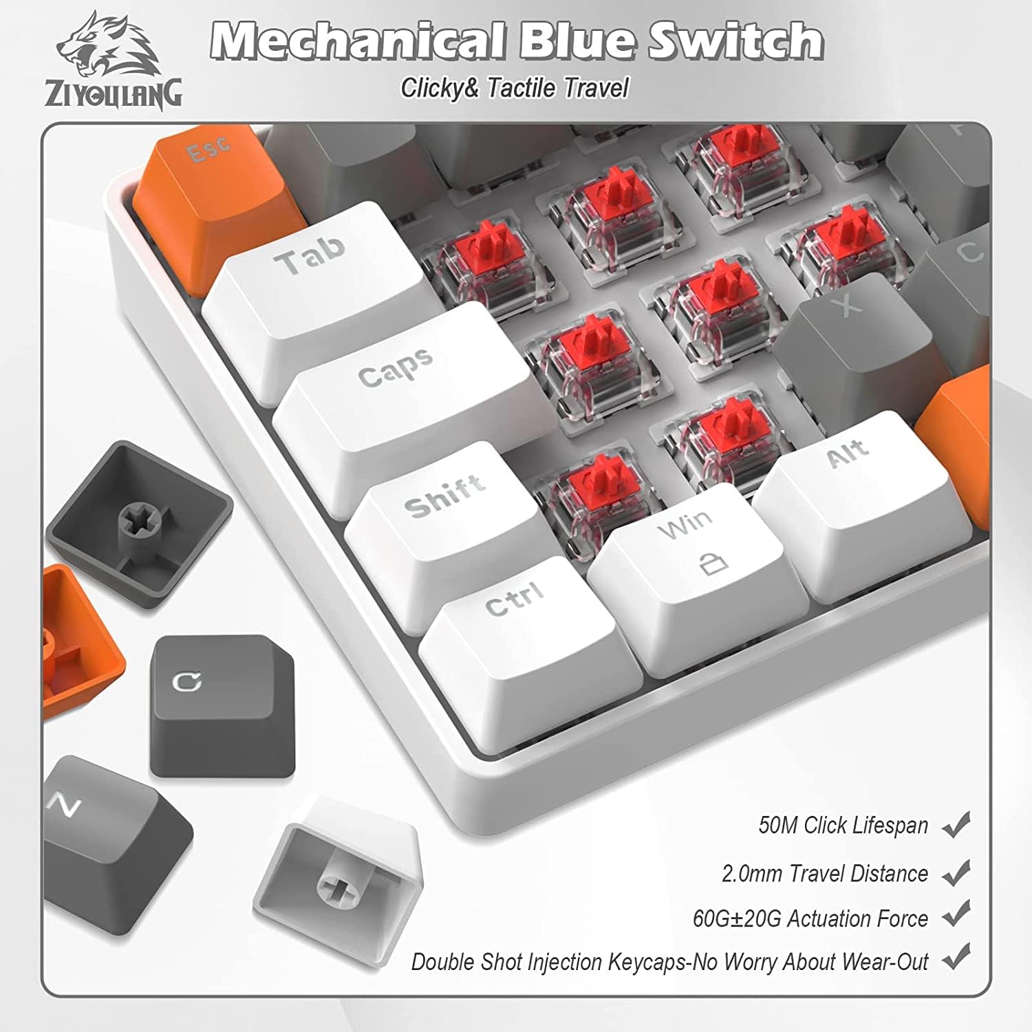 Mini 62 Tasten, kompaktes Layout: ZIYOU LANG T60 Pro ist eine tragbare und kompakte, zu 60 % mechanische Tastatur mit einer geringen Größe, die Platz auf dem Schreibtisch spart. Es kann Ihre Bedürfnisse im Büro oder zu Hause erfüllen. Ölbeständige Doubleshot-ABS-Tastenkappen haben eine haltbarere matte Oberfläche, die sich nicht leicht über einen längeren Zeitraum ansammelt, und die Schilder haben eine starke Lichtdurchlässigkeit.