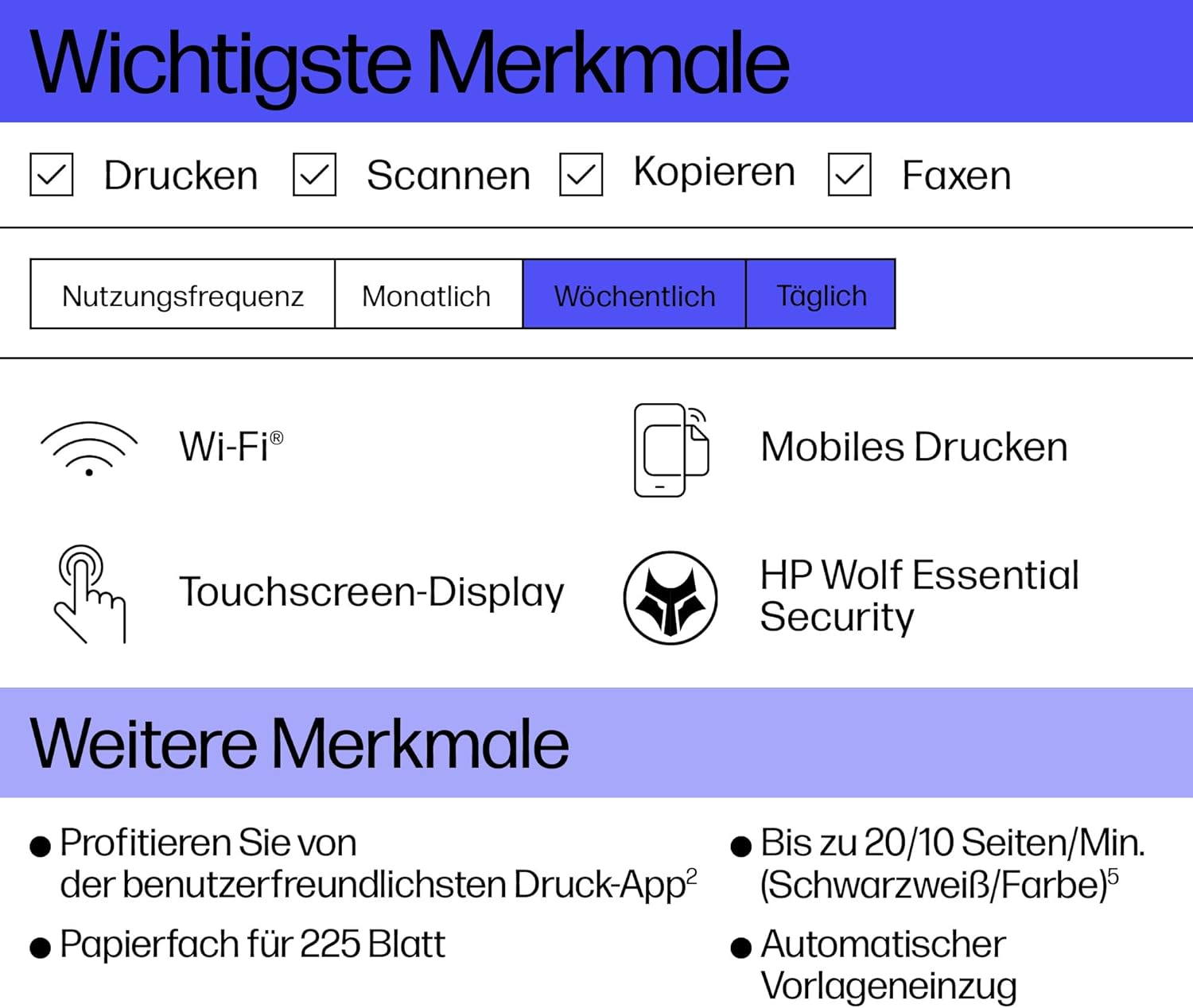 In den Warenkorb legen. In den Warenkorb legen. In den Warenkorb legen 202,02 €202,02 € Vorbild pro: Heimbüro Kleine und mittlere Unternehmen Kleine und mittlere Unternehmen Kleine und mittlere Unternehmen Nutzungshäufigkeit: Wöchentlich, täglich Täglich Täglich Täglich Funktionen: Drucken/Scannen/Kopieren/Faxen (mobil) Drucken/Scannen/Kopieren/Faxen Drucken (solange bis zu A3)/Scannen/Kopieren/Faxen Drucken (solange bis zu A3)/Scannen/Kopieren/Fernkopierer-Konnektivität WLAN, USB, Ethernet, Lok. VPN WLAN, USB, Ethernet, Lok. VPN WLAN, USB, Ethernet, Lok. VPN WLAN, USB, Ethernet, Lok. VPN-Tintentyp Druckerpatrone Druckerpatrone Druckerpatrone Druckerpatrone Druckgeschwindigkeit – 20 (s/w) / 10 (Farbton) Seiten/Min. – 25 (s/w) / 20 (Farbton) Seiten/Min. – 22 (s/w) / 18 (Farbton) Seiten/Min. – 22 (s/w) / 18 (Farbton) Seiten/Min. Papierzufuhr 225 Journal (Verteilung: 60) 2 x 250 Journal (Augabe: 100) 250 Journal, exkl. :75(A4) 50(A3) 500 Journal, exkl. :75(A4) 50(A3) Bedienfeld 2,7 Zoll (6,9 cm) Farb-Touchscreen 4,3 Zoll (10,9 cm) Farb-Touchscreen 2,7 Zoll (6,9 cm) Farb-Touchscreen 4,3 Zoll (10,9 cm) Farb-Touchscreen Selbsttätig Duplex bedruckt ✔ ✔ ✔ ✔ HP Smart App ✔ ✔ ✔ ✔ Managementlösungen APLUS FALSE APLUS FALSE APLUS FALSE APLUS unehrlich HP InstantInk-kompatibel ✔ ✔ ✔ ✔