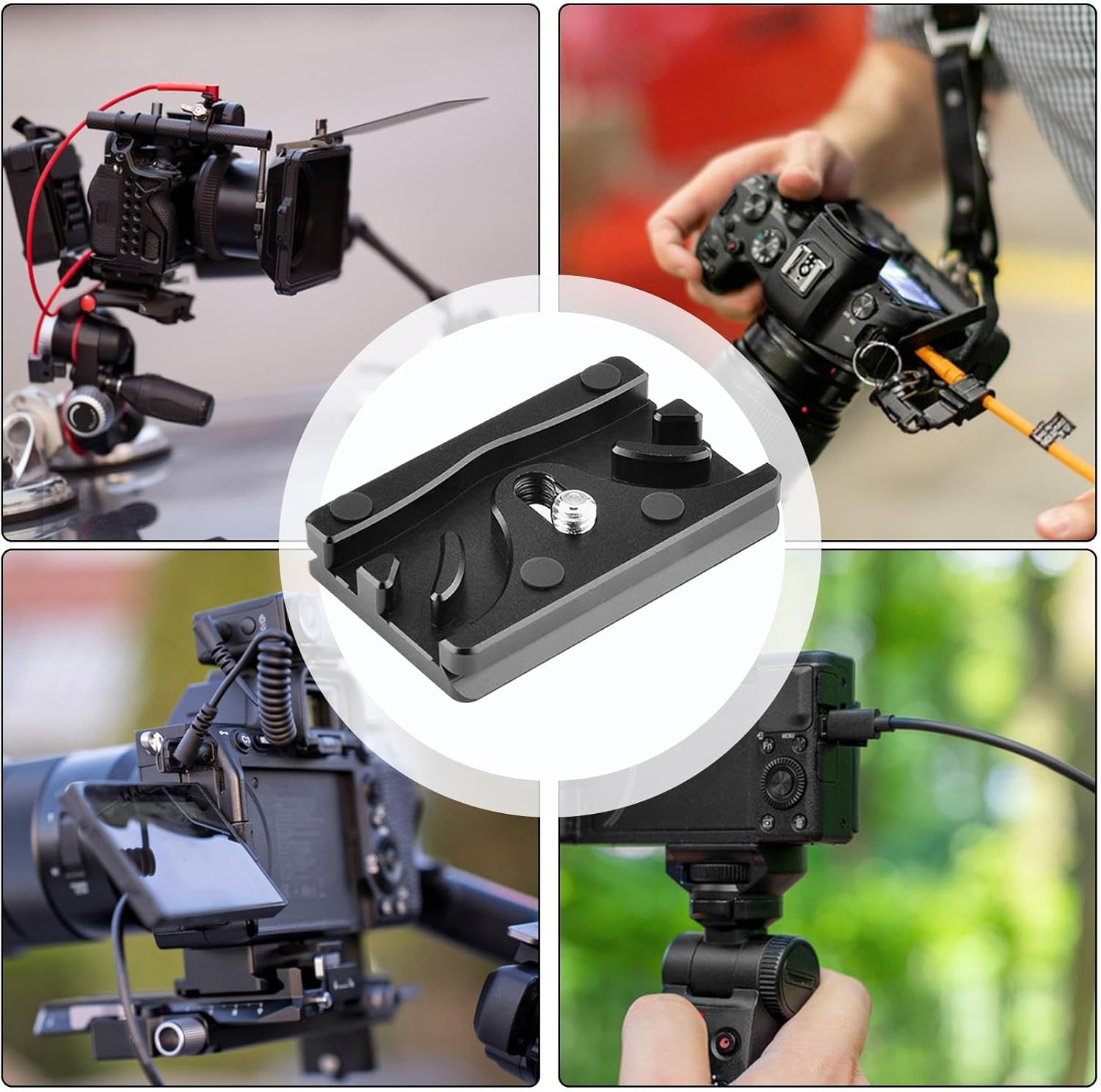 Durch die Möglichkeit, mehrere Kabel zu befestigen, minimiert die Kamerakabelklemmplatte den Kabelsalat und sorgt für eine reibungslose Organisation von Griffen und Monitoren bei kreativen Projekten