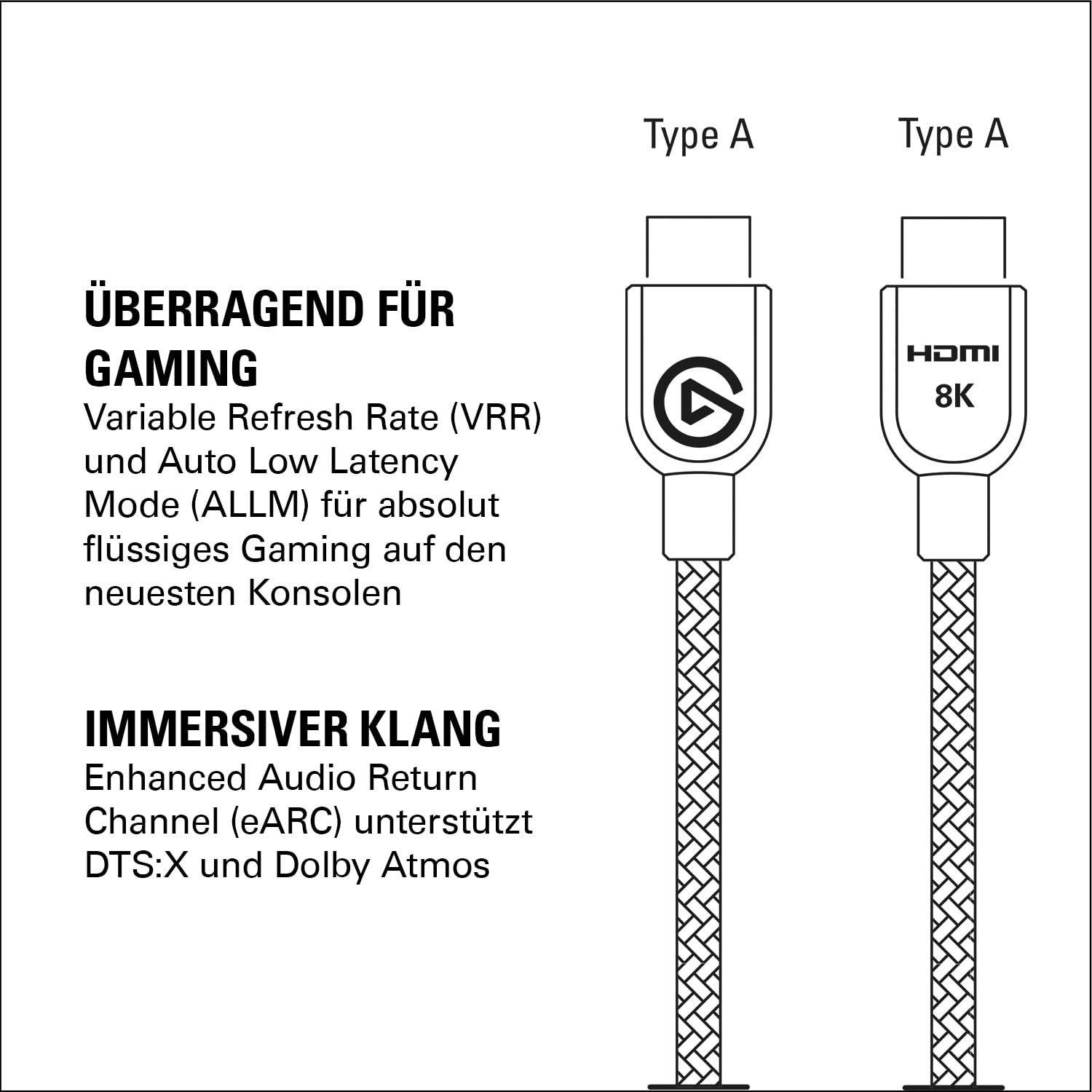 Elgato Ultra High Speed HDMI Cable – HDMI 2.1 Certified, 48 Gbps, Supports 8K@60Hz, 4K@120Hz, Dynamic HDR, eARC, Dolby Atmos, Compatible with HD60X, Sony PS4/PS5, Xbox Series X/S etc