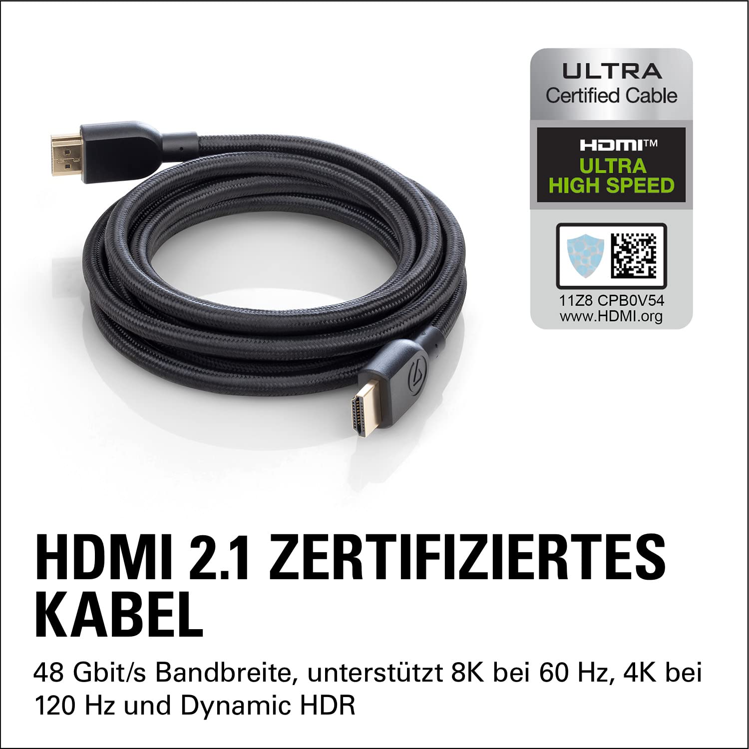 HDMI 2.1-zertifiziertes Kabel: 48 Gbit/s Bandbreite, unterstützt 8K@60Hz, 4K@120Hz und Dynamic HDR.