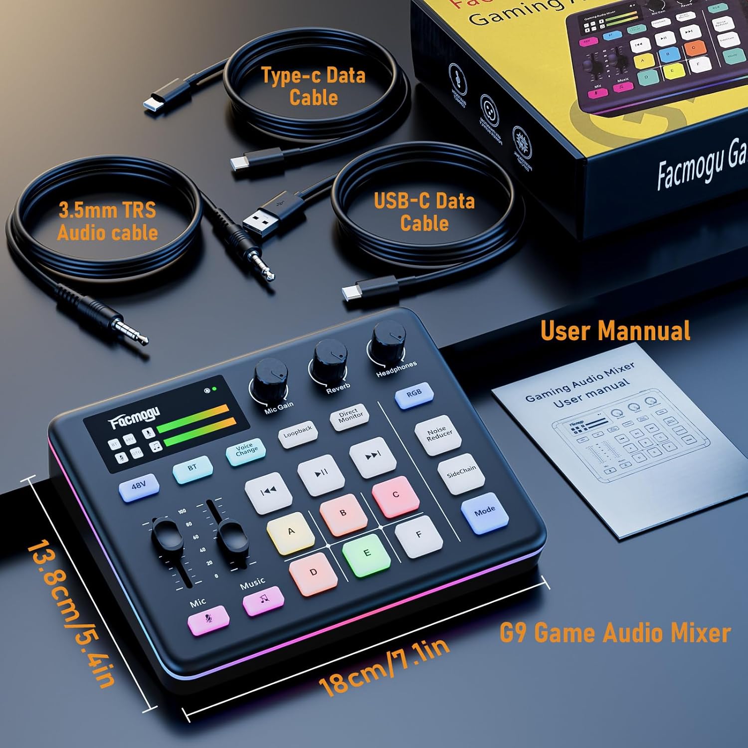 Facmogu G9 Gaming Audio Mixer, Audio Interface with 3.5 mm/XLR Mic In, RGB, Bluetooth, 48 V Phantom Power, Voice Changer, Live Sound Card Board for Live Streaming, Podcast, Gaming – Not for USB Mic