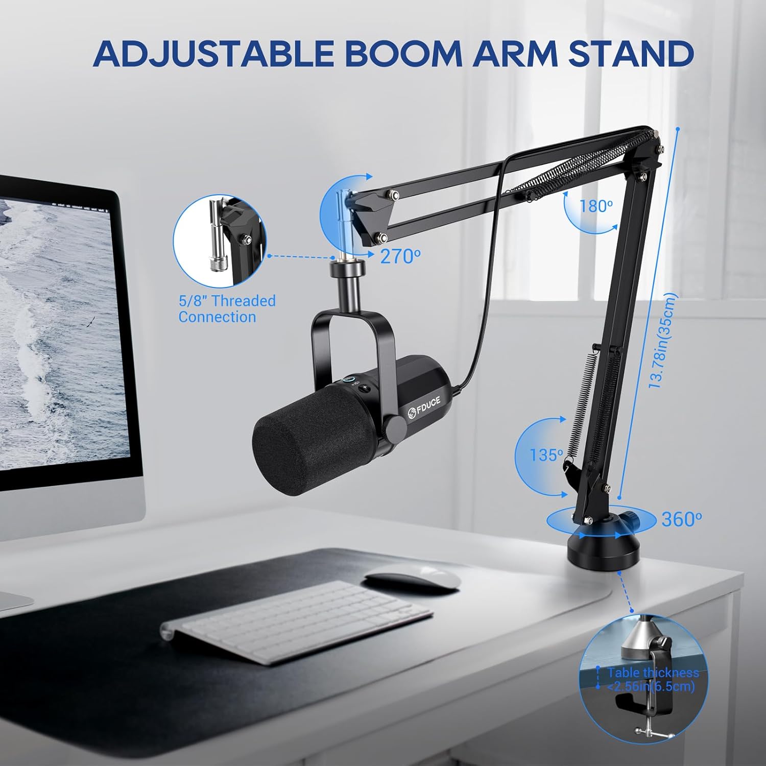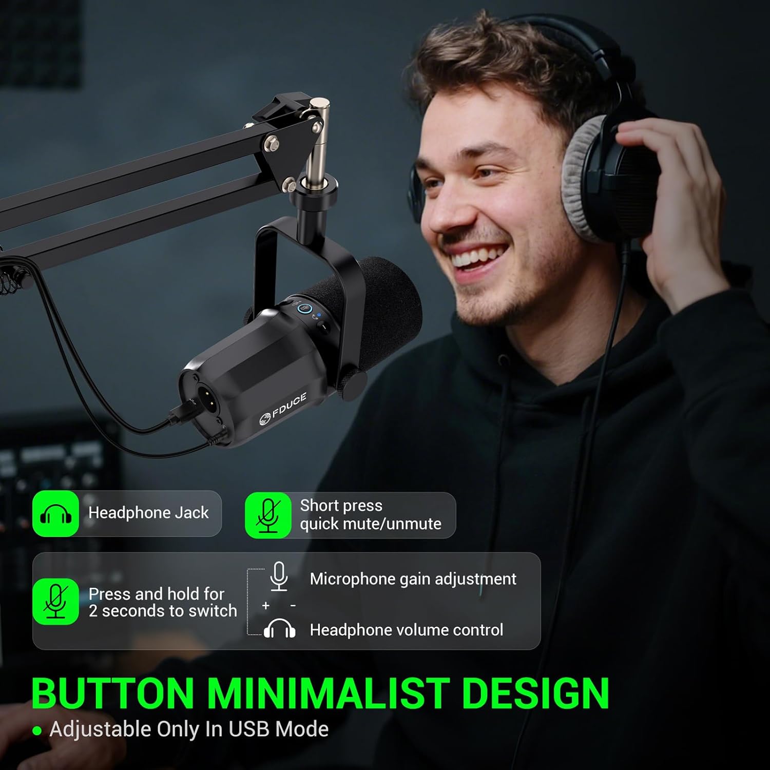 FDUCE SL40+ Dynamic Podcast Microphone, USB/XLR Microphone Set for Gaming and Streaming, Dynamic Microphone with Boom Arm Stand, Integrated Head Output, Mute Button, Gain Button