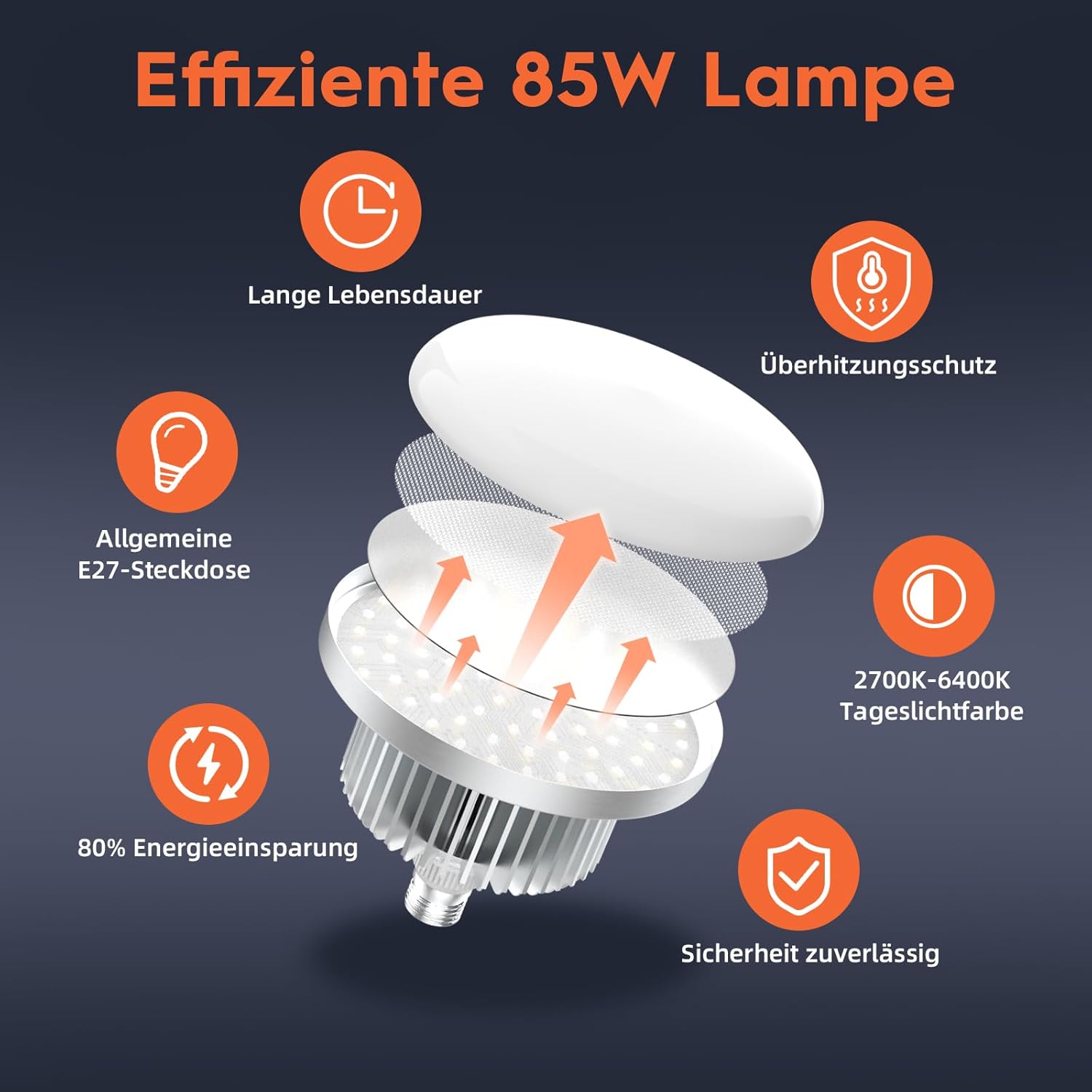 【Dreifarbige LED-Lampen】 Die 85-W-LED-Lampen sind in drei Lichtmodi erhältlich: weiße, kalte und warme Farben, die weiches Licht erzeugen und für eine bessere Beleuchtung sorgen. Farbtemperatur 2700 K – 6400 K, Helligkeit 1 % – 100 %, leicht anpassbar, um Ihren unterschiedlichen Bedürfnissen gerecht zu werden. Im Vergleich zu Energiesparlampen haben LED-Lampen eine längere Lebensdauer und einen geringeren Energieverbrauch.