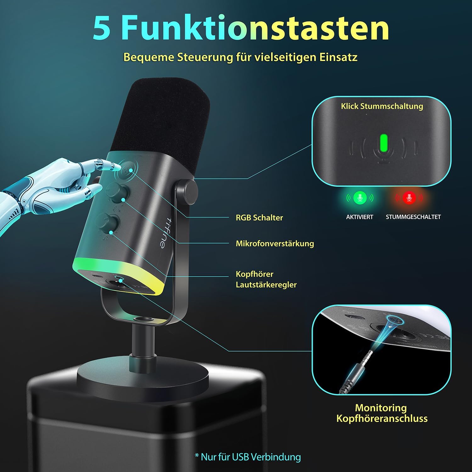 Steuerbare RGB-Beleuchtung: Das Gaming-Mikrofon verfügt über einen RGB-Ring mit 3 Beleuchtungsmodi und über 10 verschiedenen Farben. Mit der RGB-Tastensteuerung können Sie zwischen verschiedenen Farbschemata für Ihr Gaming-Setup wechseln. Die beeindruckenden Lichteffekte machen Ihre Gaming-Videos oder Live-Streams zu echten Hinguckern. Der RGB-Ring verfügt über eine Memory-Funktion und wird beim Einschalten automatisch aktiviert. (Nur für USB-Anschluss geeignet).