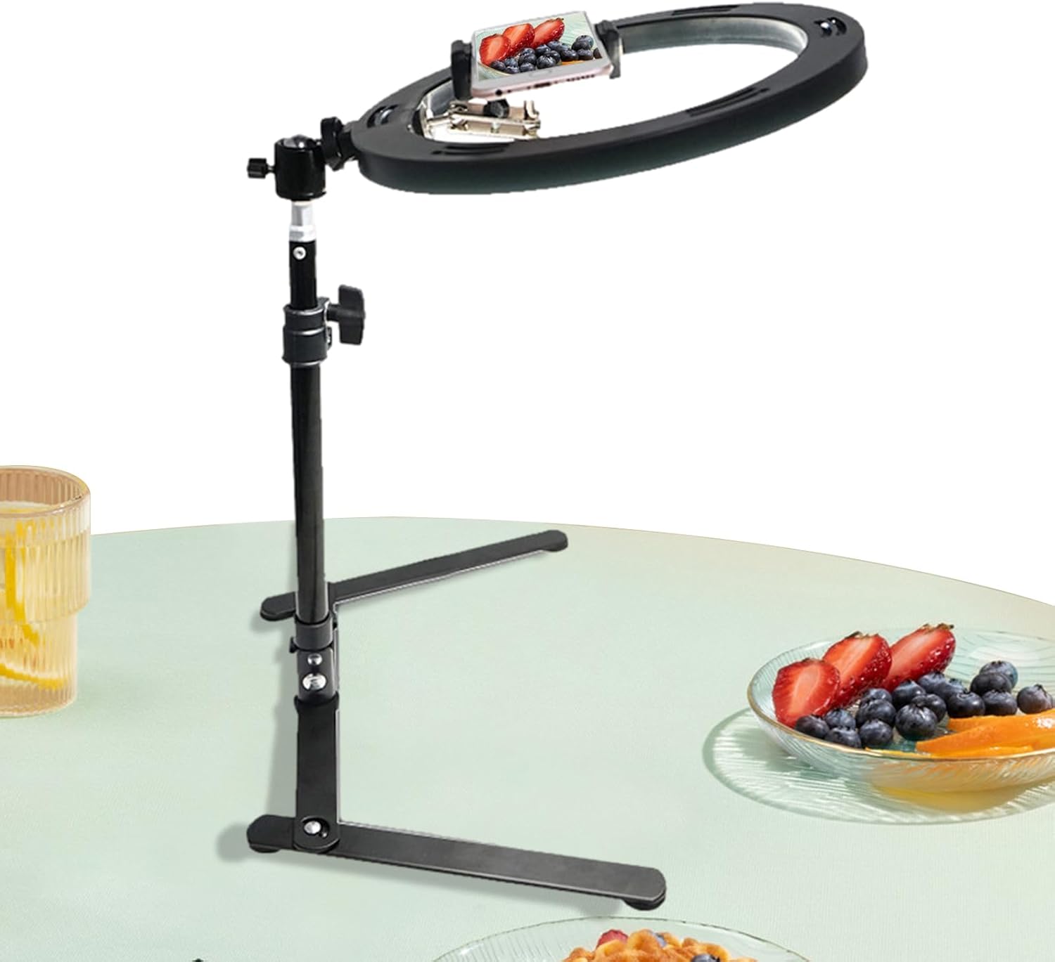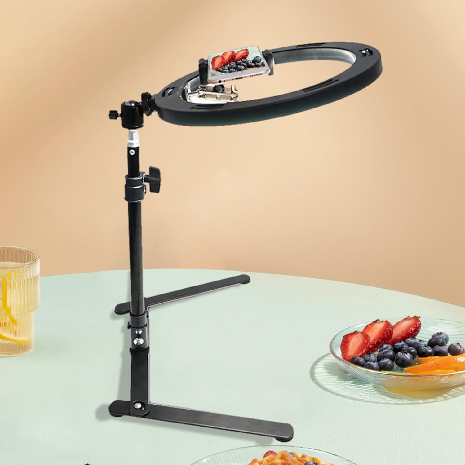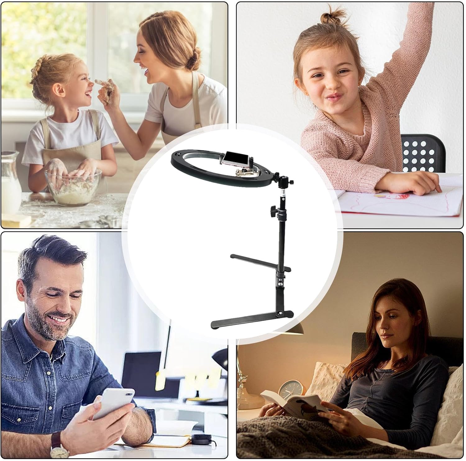 Stellen Sie mit dem LED-Ring dieses Lufttelefonhalters und multifunktionalen Handyhalters sicher, dass Sie die beste Beleuchtung und den besten Winkel für Ihr Video erhalten. Mit der verstellbaren Tischhalterung können Sie die Höhe verändern und erhalten so vielseitige Beleuchtungs- und Winkeloptionen für Videoaufnahmen.