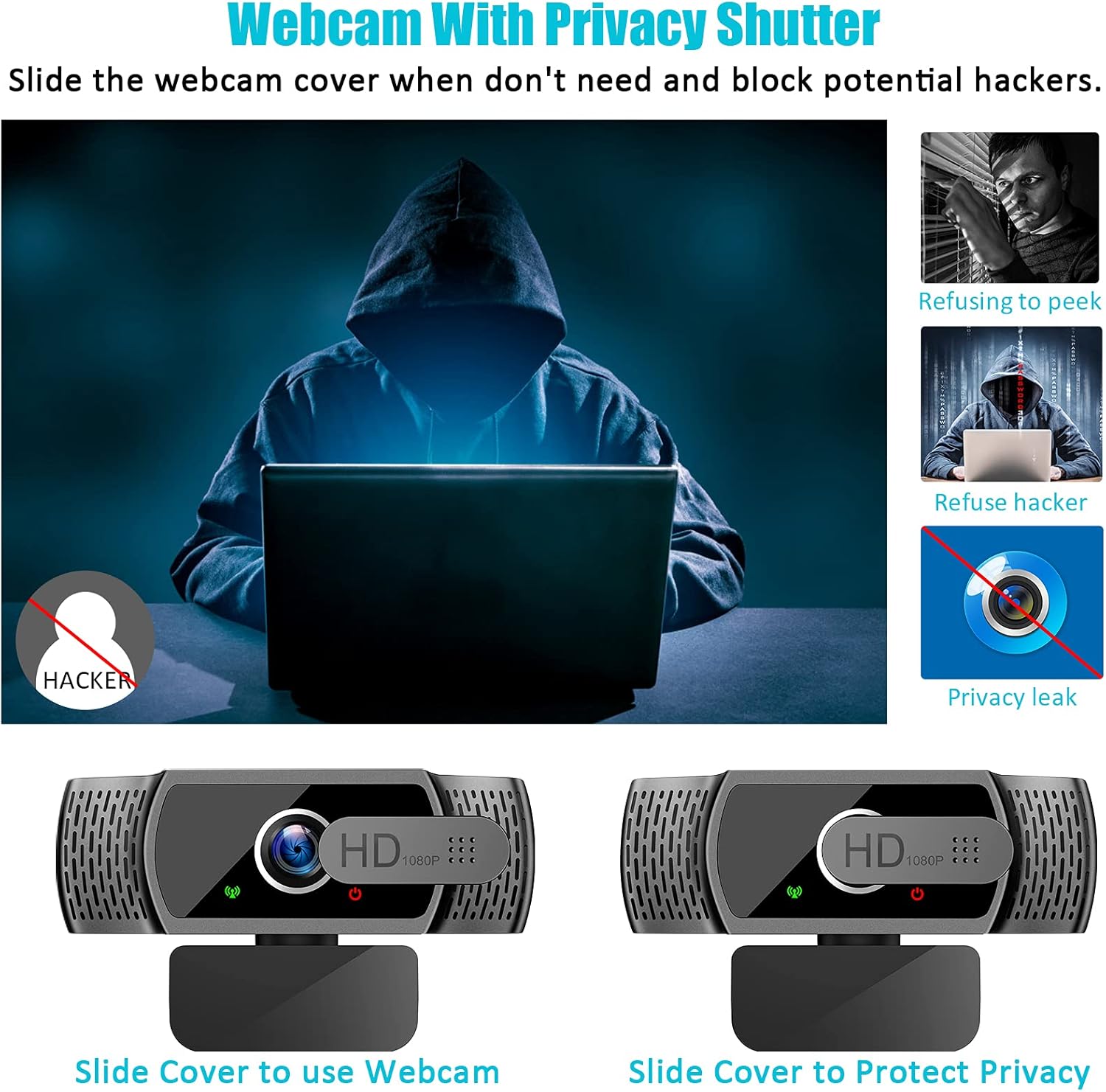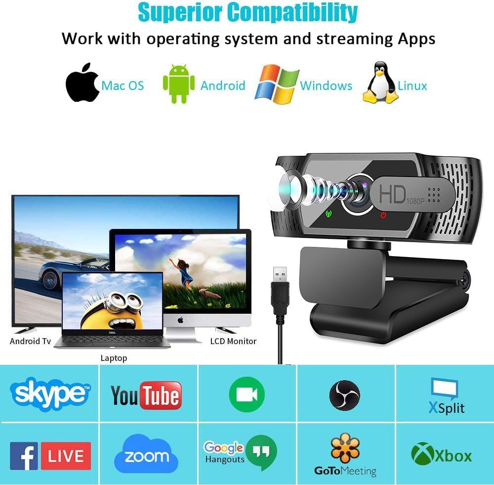 Full HD1080P Webcam with Microphone, Automatic Light Correction, USB PC Webcam with Cover, 110° Wide Angle, PC Camera for PC, Laptop, Computer, Linux, Mac