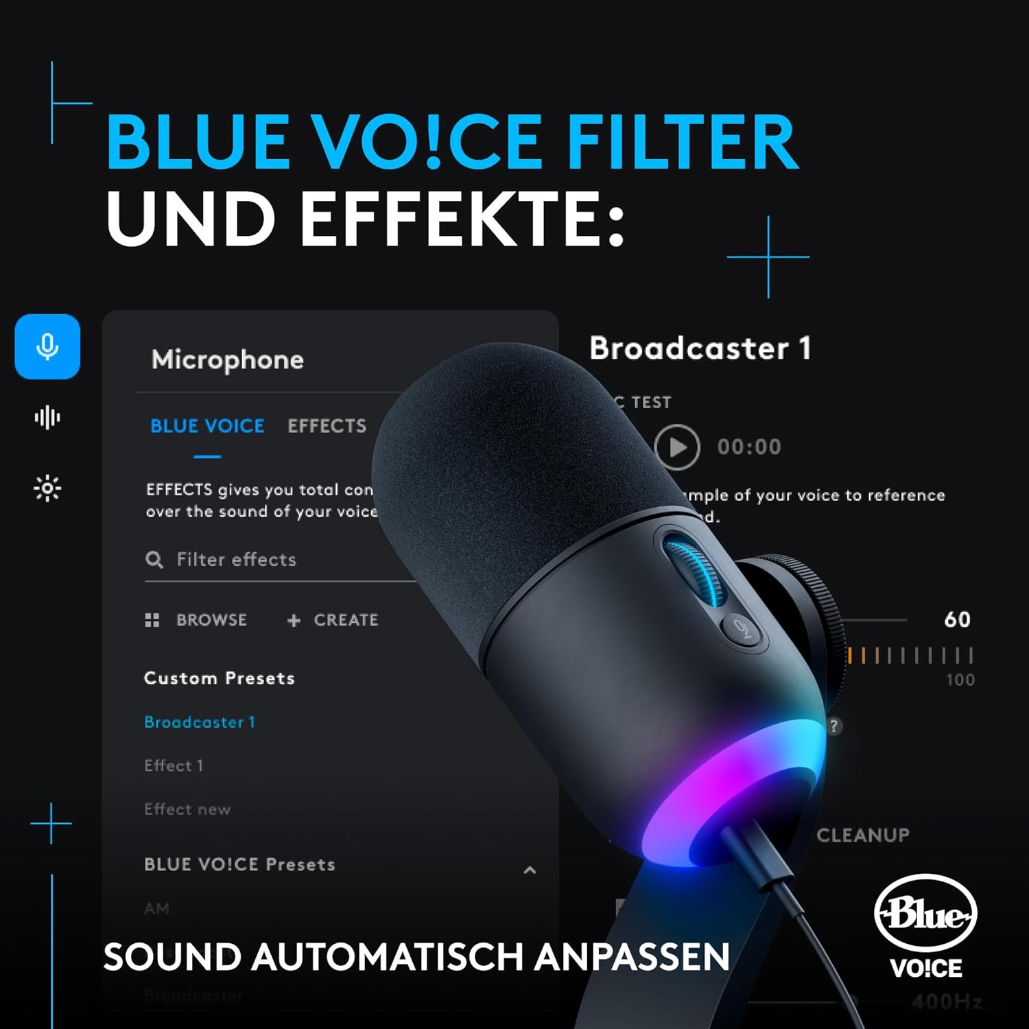 Blue VO!CE-Filter und -Effekte: Aktivieren Sie die intelligente Audiosperre und andere Studio-Tools; Verwenden Sie Blue VO!CE-Filter, -Effekte und -Samples, um Ihr Stream-Publikum zu unterhalten und mit ihm zu interagieren