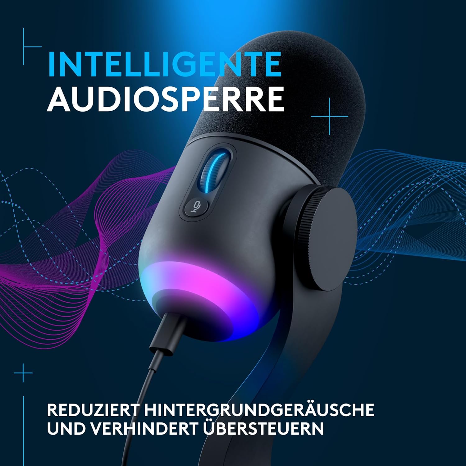 Zwei RGB-Zonen: Steuern Sie die beiden separaten RGB-Beleuchtungszonen am Mikrofon mit LIGHTSYNC und synchronisieren Sie sie im G HUB mit anderen Logitech G-Gaming-Geräten für ein völlig immersives Spiel