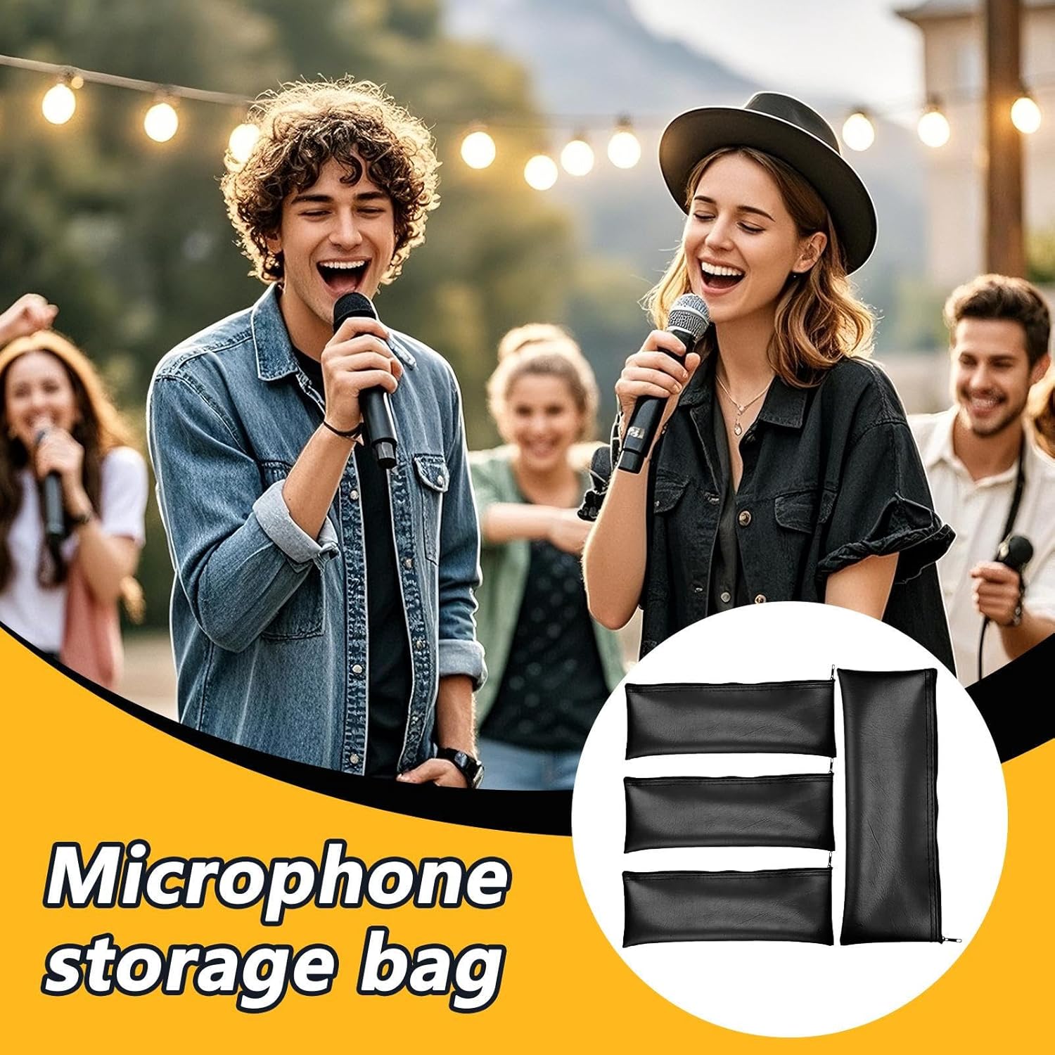 Microphone Bag – 4 Pack PU Leather Cases with Drawstring Zipper, Dustproof Storage for DJ Setup, Karaoke Equipment, Streaming Station, Live Performance Aid, Recording Organiser, Party Supplies
