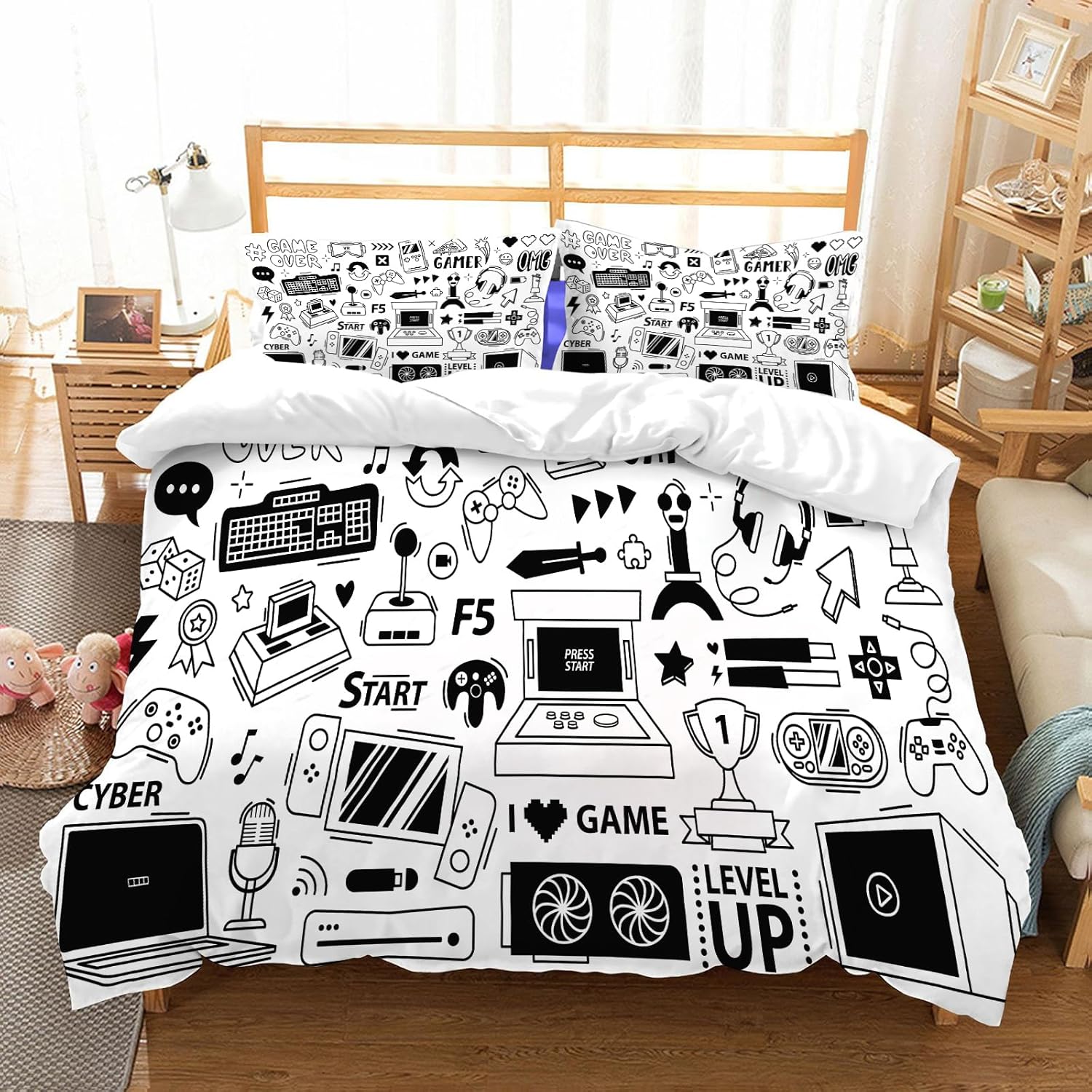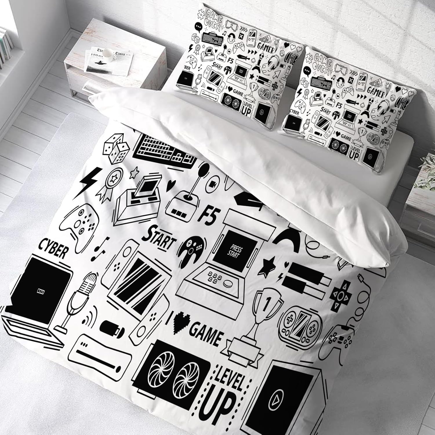 MYAUEYSU Bed Linen Set, 100% Cotton, Gaming Streaming Doodle, Gamer Equipment for Games and Controllers for Cyberspo, and Everything Also Recommended for People with Skin Sensitization, 152 x 203 cm