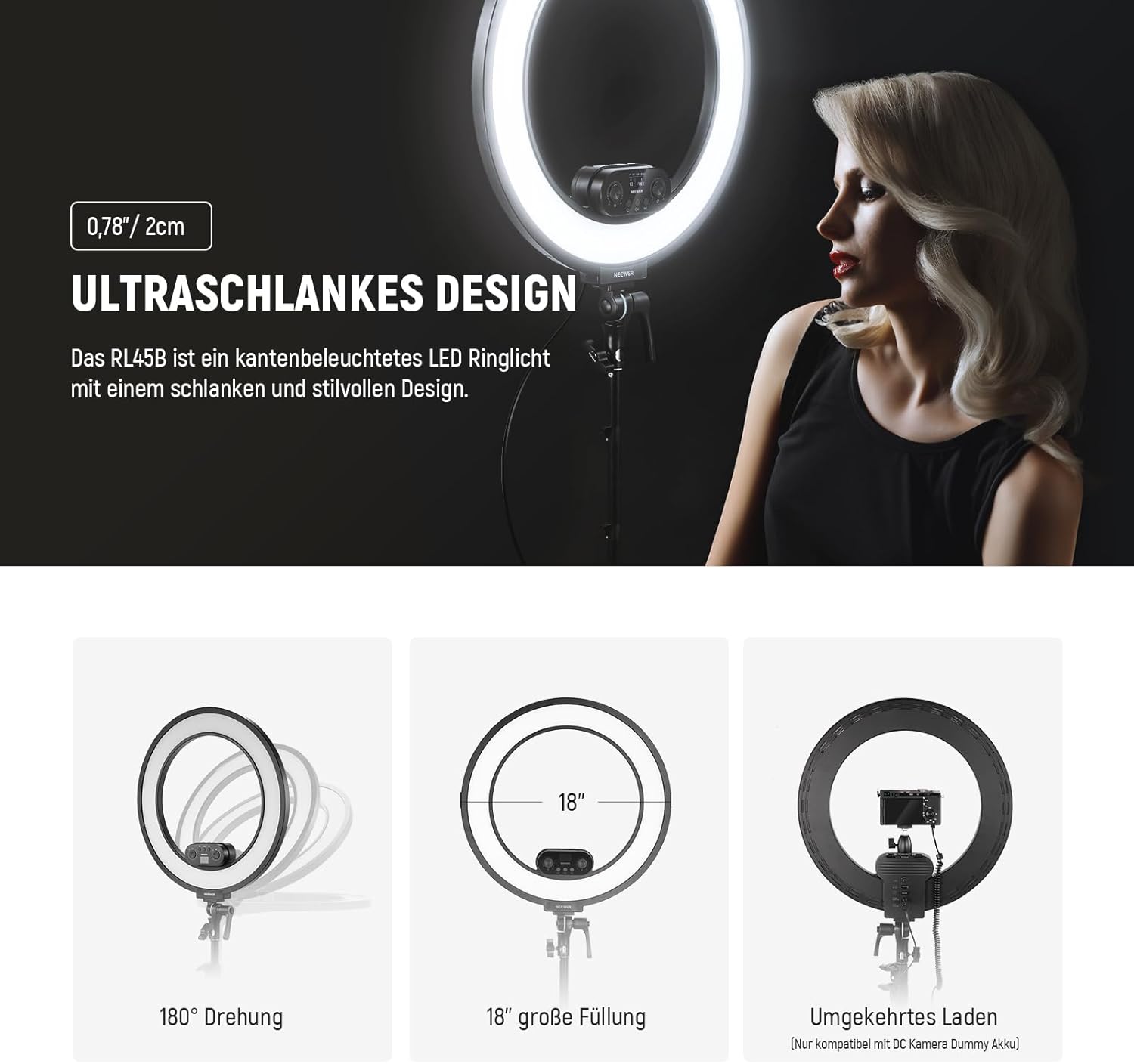 18-Zoll-Set mit kantenbeleuchteten, schlanken LED-Ringlampen: Das Ringlicht RL45B ist ein kantenbeleuchtetes LED-Ringlicht mit schlankem Design. Mit 288 Premium-LEDs verfügt es über einen CRI 97+ für eine präzise Farbwiedergabe und eine max. Leistung von 45 W bei 3300 Lux/0,5 m Beleuchtungsstärke. Die kreisförmige Lichtform ist weich und gleichmäßig verteilt und lässt Ihre Augen hervorstechen. Es verfügt über einen 180°-Stativmontageadapter und ein umkehrbares Lichtstativ für eine flexible Lichtpositionierung