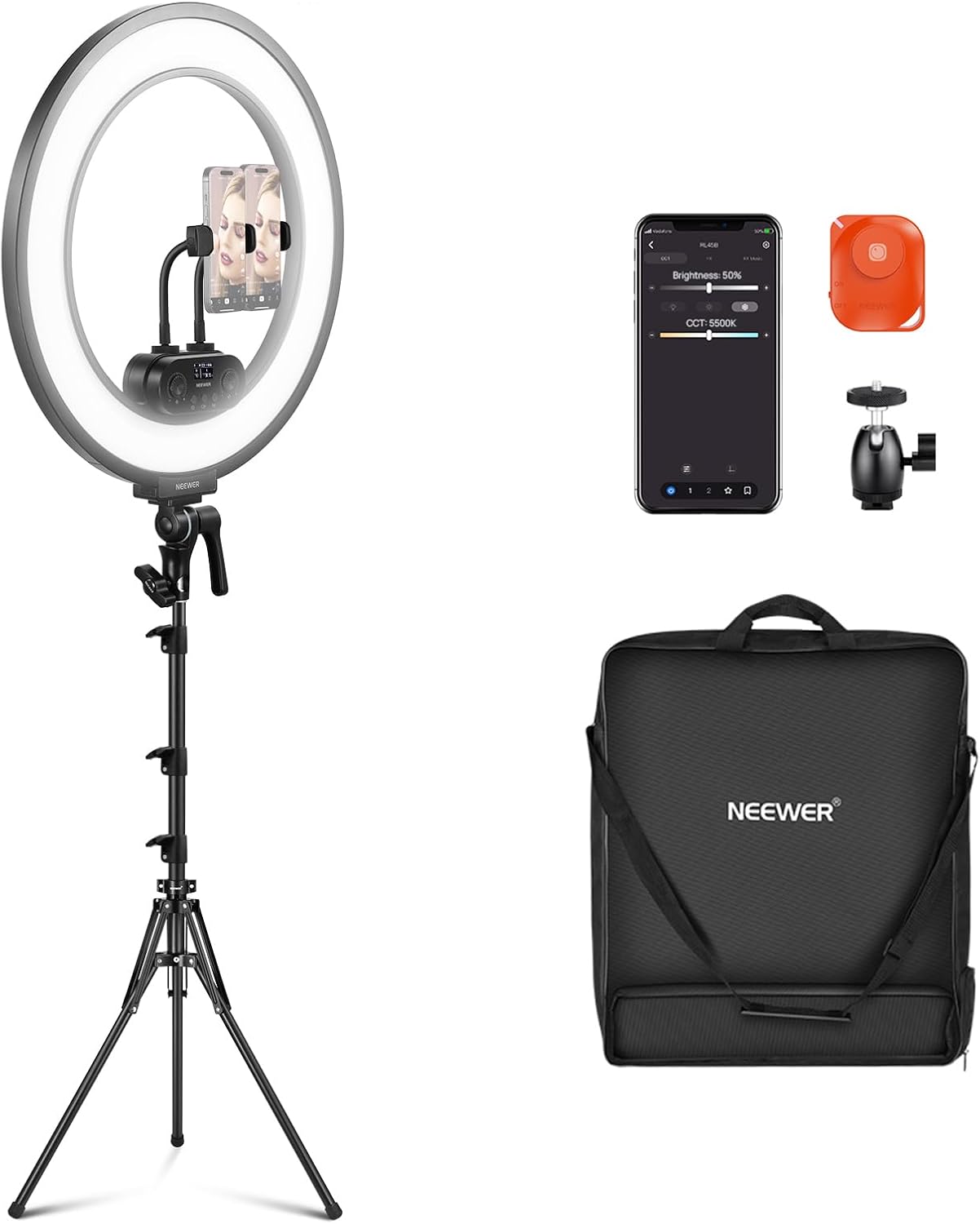 NEEWER 18 Inch Ring Light Set with Edge Lighting, 45 W 3300 Lux 2900 K-7000 K 12 Scenes Ring Light with App 2.4G PC Mac Control, Remote Control, Tripod Bag for Makeup, TikTok, Ins, Live Stream, RL45B