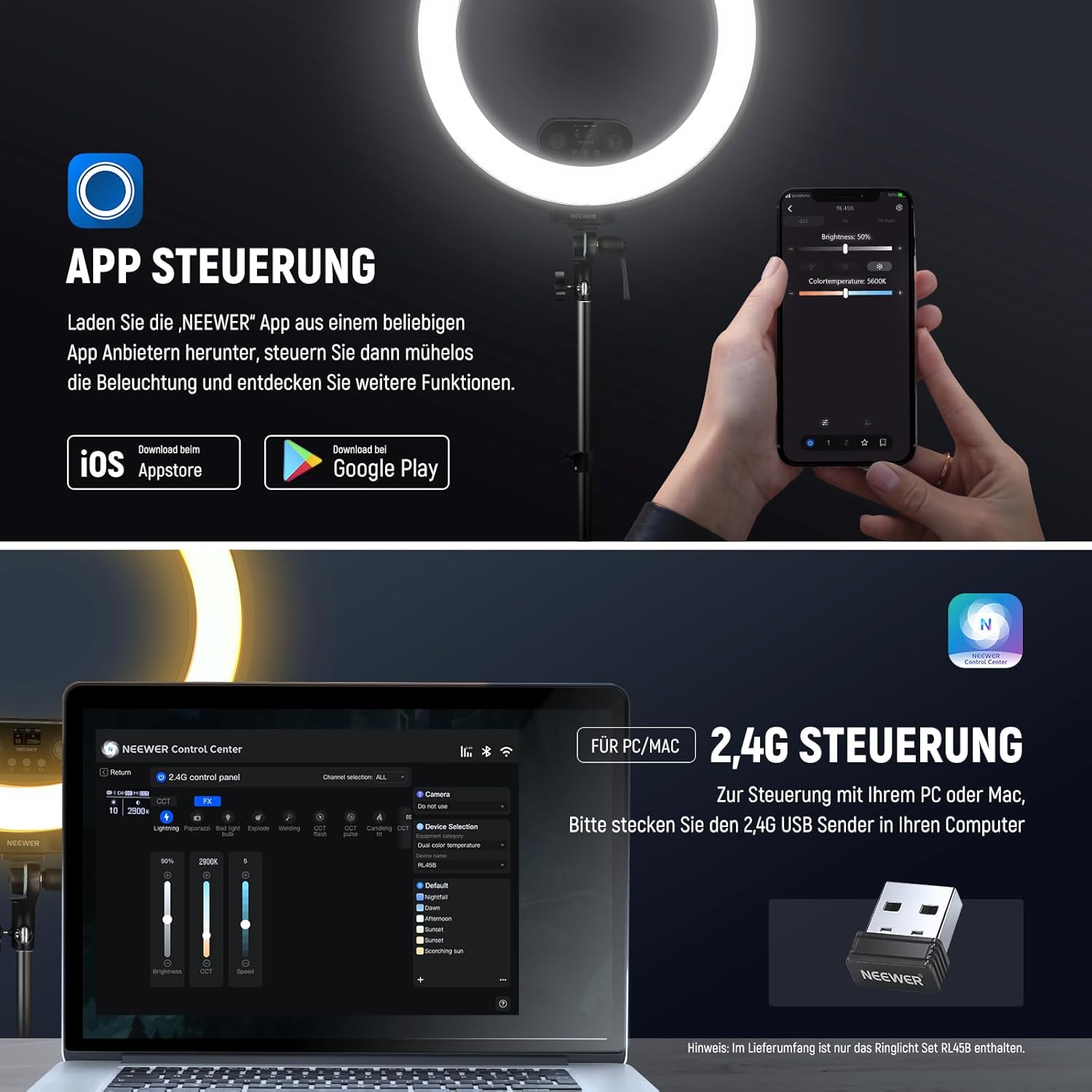 App/2.4G-Steuerung für PC und Mac: Laden Sie die „NEEWER“-App aus einem beliebigen App-Store herunter, koppeln Sie Ihr Telefon über Bluetooth mit dem RL45B in der App, steuern Sie dann mühelos die Beleuchtung und erkunden Sie andere Funktionen. Zur Steuerung mit Ihrem PC oder Mac schließen Sie bitte den 2,4-G-USB-Sender an Ihren Computer an und laden Sie die Software „NEEWER Control Center“ herunter. Stellen Sie RL45B und die Software auf denselben Kanal ein, um die Beleuchtung zu steuern