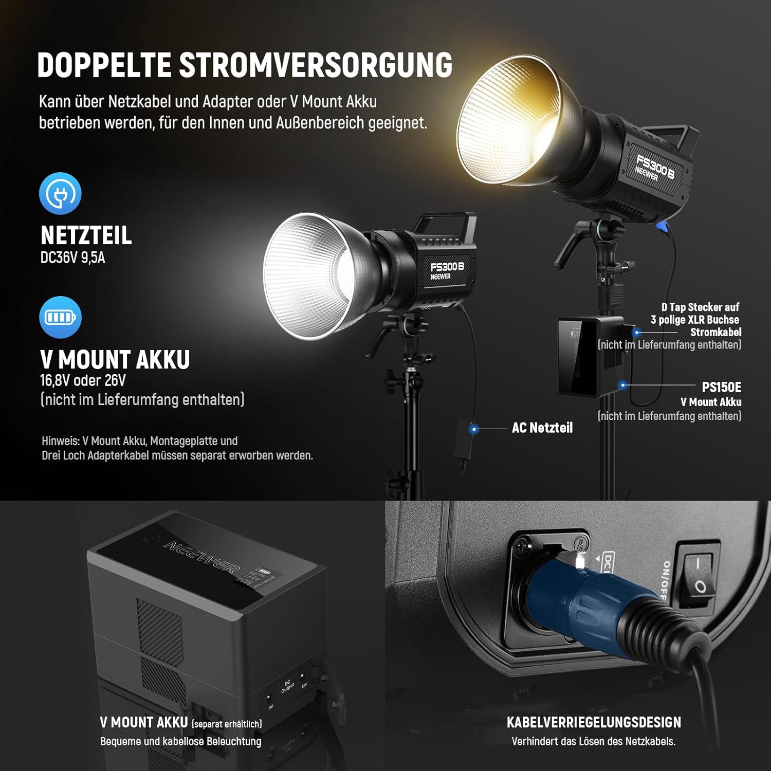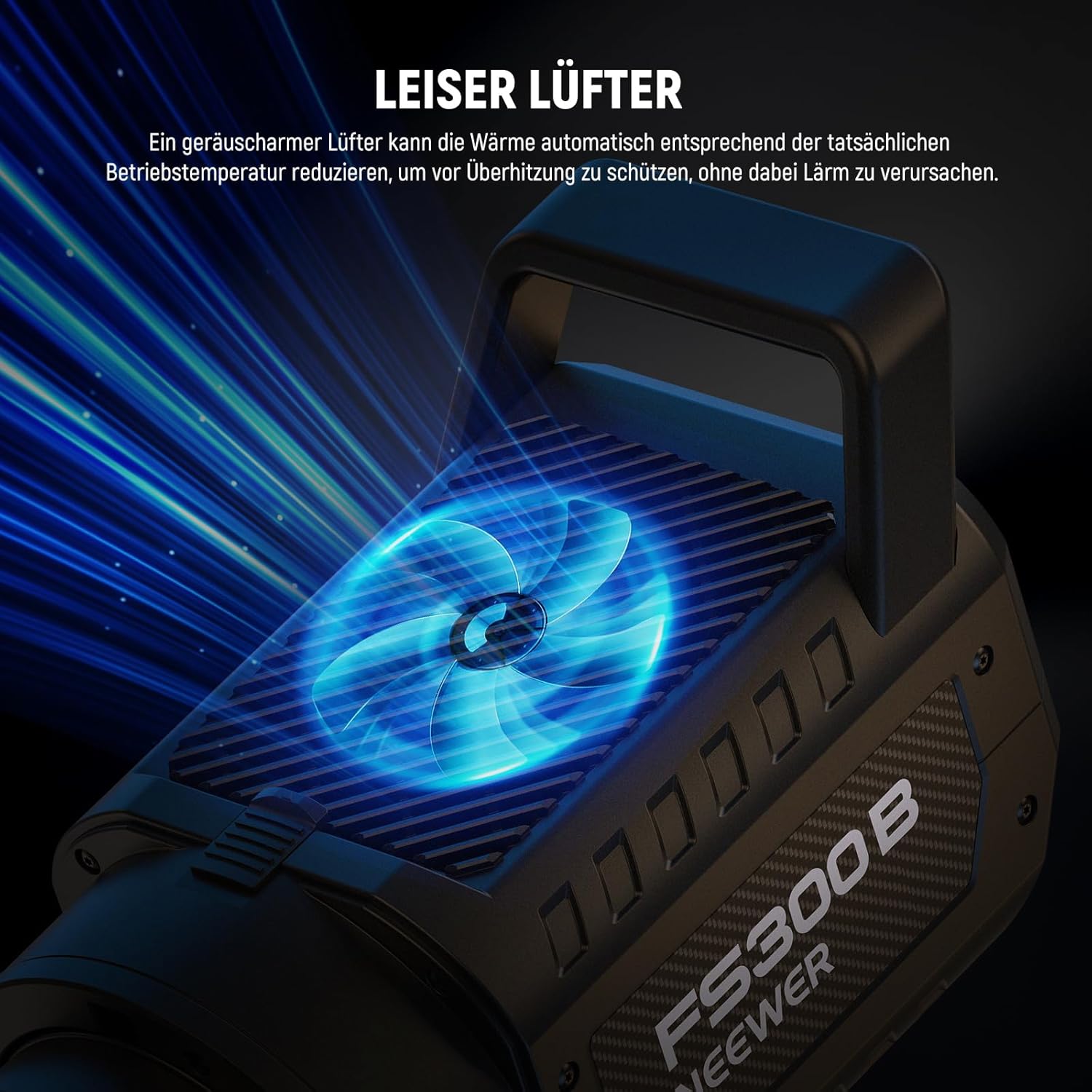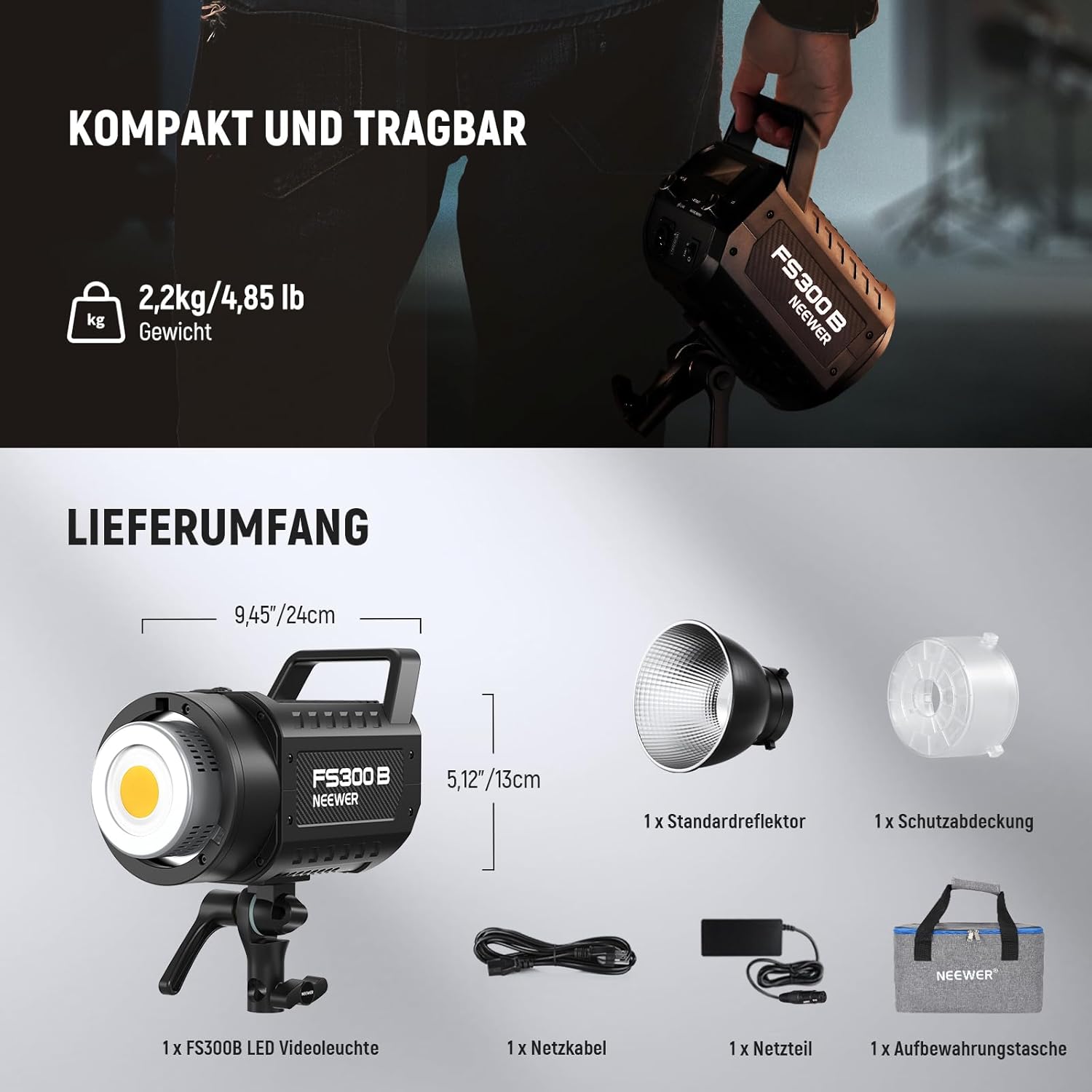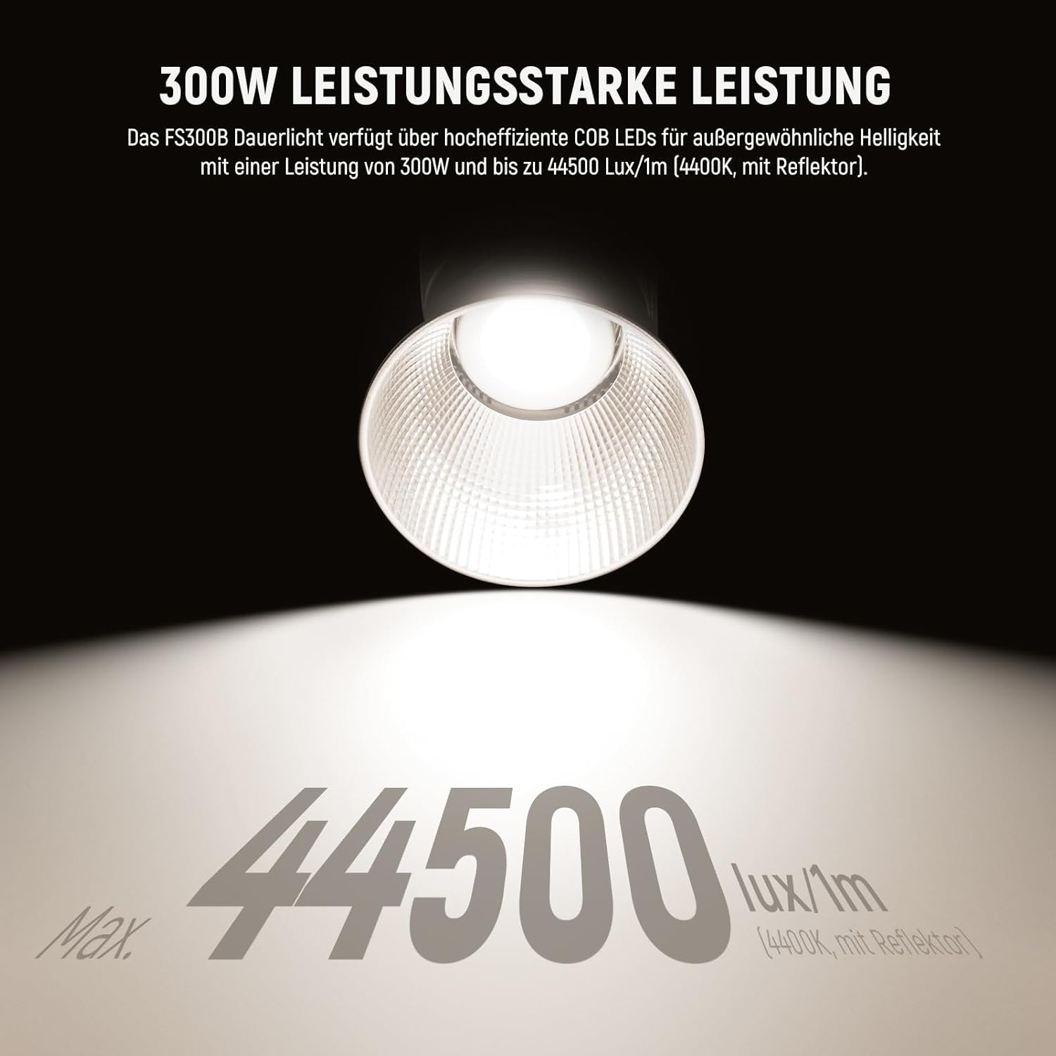 300 W powerful video light: The FS300B studio light has highly efficient COB LEDs for exceptional brightness with a power of 300 W and up to 44500 Lux/1 m (4400 K, with reflector). This portable headlight measures 9.45 x 7.68 x 5.12 inches and weighs 4.85 lb. It has a 180° tilt adapter for tripod mounting. Ideal key and softlighting equipment set for portrait, photography, interviews, podcasts, YouTube/TikTok, video, film, live streaming and studio