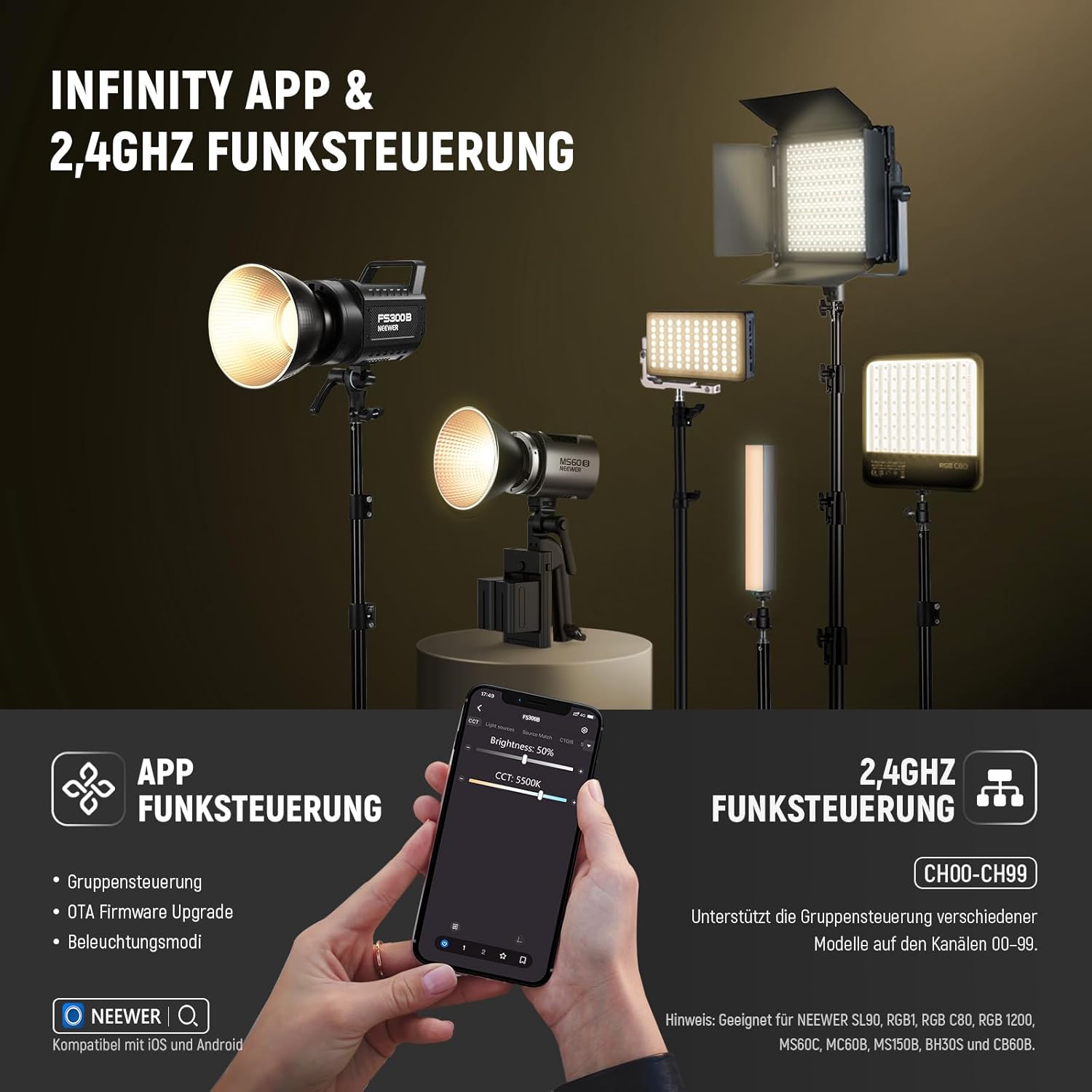 Infinity app and 2.4 GHz radio control: the NEEWER app supports group control and OTA firmware updates. It also offers features such as light source, source adjustment, CTO/B, FX music and other functions for advanced lighting control. The integrated 2.4GHz system supports group control of different models (including SL90, RGB1, RGB C80, RGB 1200, MS60C, MC60B, MS150B, BH30S and CB60B) in channels 00-99