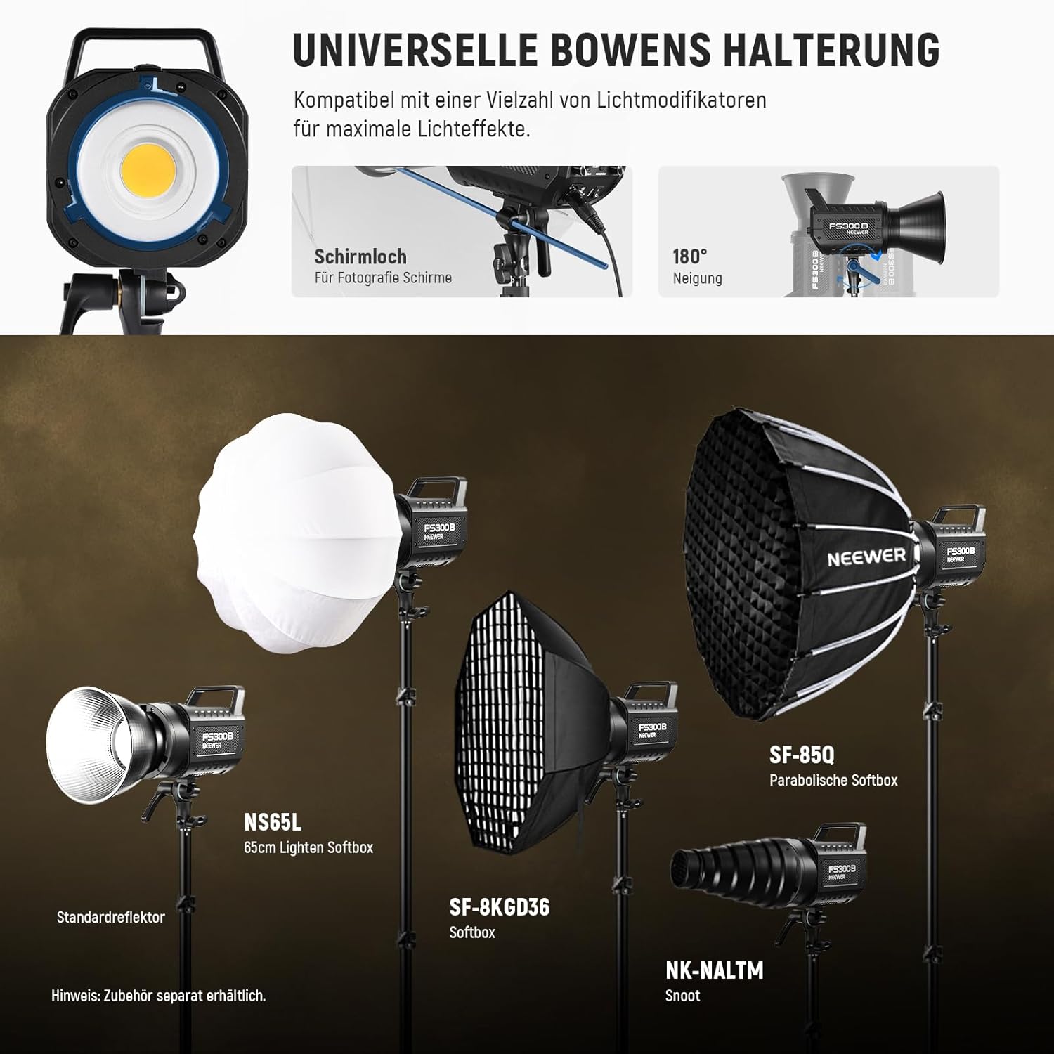 Standard bowens mount and quiet fan: the included reflector with a scale pattern inside distributes the light evenly and is an indispensable accessory for content creators and influencers. The Bowens Mount is compatible with softboxes, snoots, beauty dishes etc. An umbrella and a reflector can be attached to the holder at the same time. A quiet fan automatically reduces heat according to the actual operating temperature and thus protects against overheating