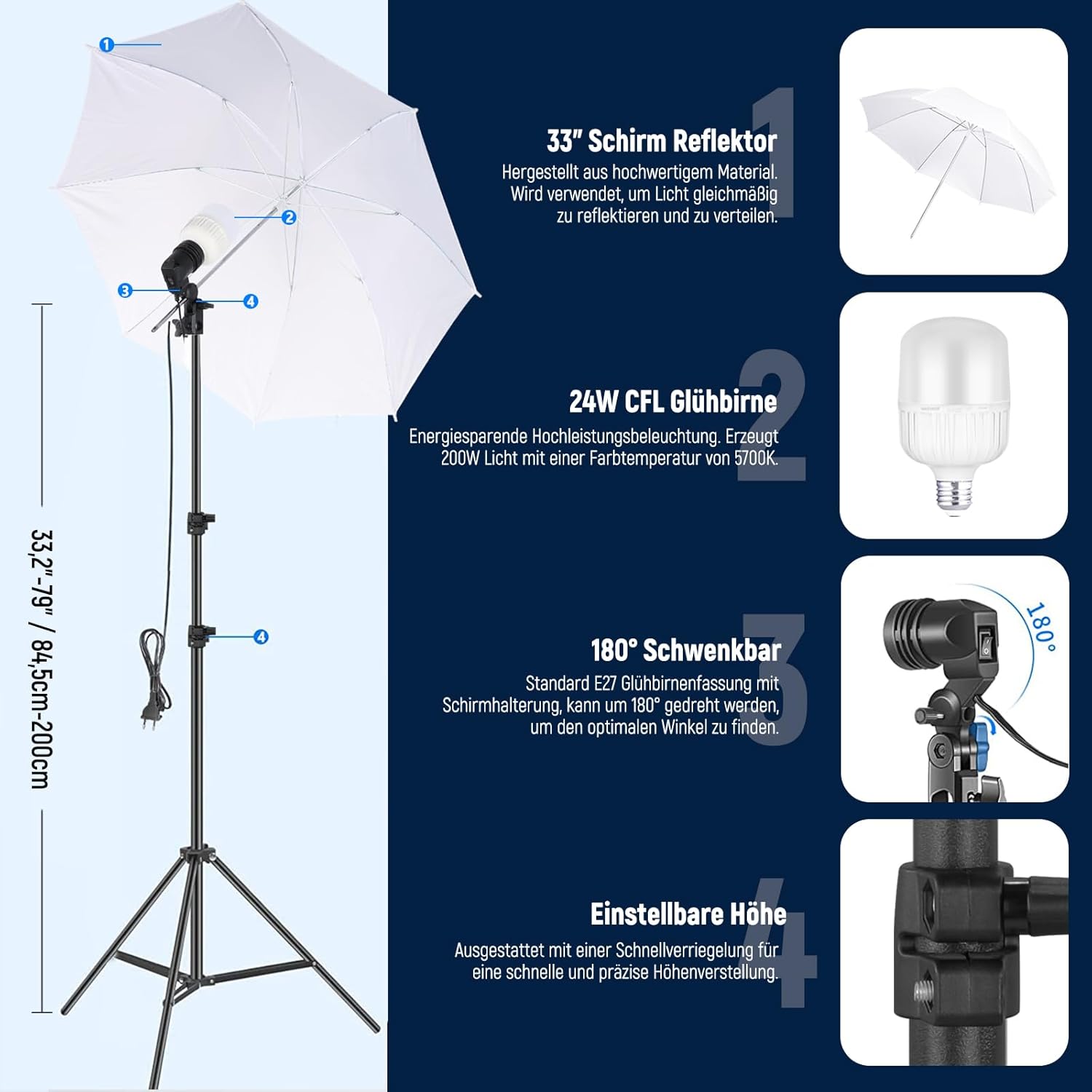Schirme zur Lichtsteuerung und 24 W 5700 K LED-Glühbirne: Die 84 cm großen, weißen, durchscheinenden Schirme können die Lichtleistung jeder Studioleuchte oder Blitzlichtquelle abschwächen und verlängern. Im Set sind vier 24 W 5700 K LED-Leuchtmittel enthalten, die jeweils einer normalen 200 W-Glühbirne entsprechen, mit einer Farbtemperatur von 5700 K, ideal für die Beleuchtung von Studioaufnahmen
