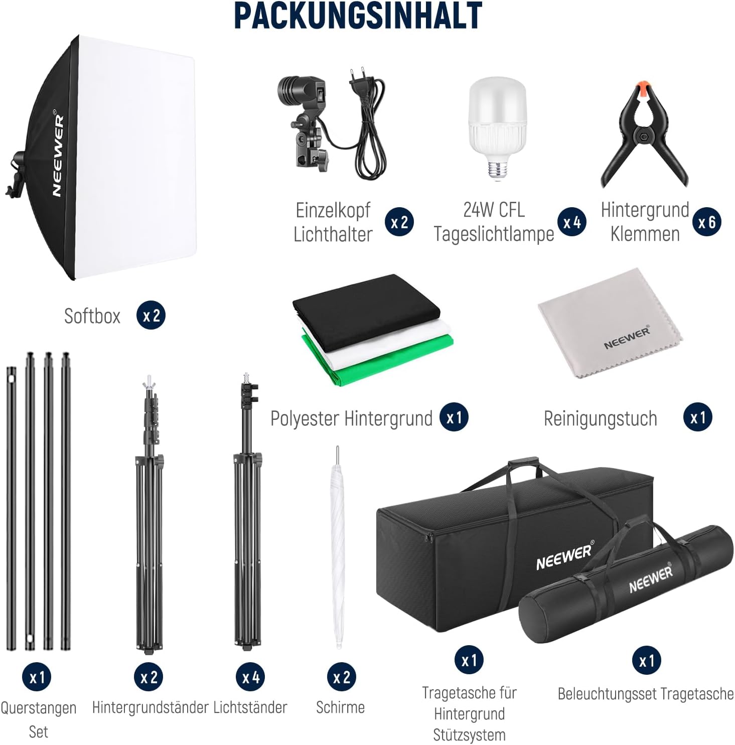 All-in-One-Fotohintergrund-Set: enthält 4 x 200 cm Lichtstative, 2 x Einzelkopf-Lichthalter, 4 x 24 W 5700 K LED-Lampen (entspricht zusammen einer 800 W normalen Glühbirne), 2 x 84 cm Schirm, 2 x Softbox (60 x 60 cm), 3 x Polyester-Hintergrund (1,8 x 2,8 m) (schwarz/6 x Hintergrundklemmen, 1 x Hintergrund-Stativ-Stützsystem). (2,6 x 3 m), 1 x Tragetasche für Hintergrundträgersystem, 1 x Tragetasche für Dauerlichtset und 1 x Reinigungstuch