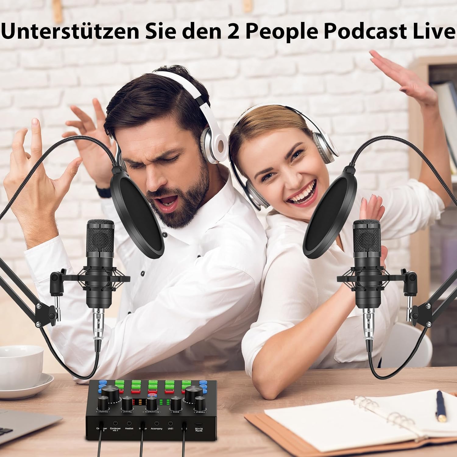 Inhalt (Set für 2 Personen): 1x Audio-Interface, 2x Kondensatormikrofon, 2x Schwanenhalsmikrofon, 1x 3,5-mm-Kopfhörer, 2x Anti-Vibrations-Aufhängung, 2x Pop-Filter, 2x Windschutz, 2x XLR-Kabel, 1x USB-Kabel, 2x 3,5-mm-Audiokabel, 1x Bedienungsanleitung.