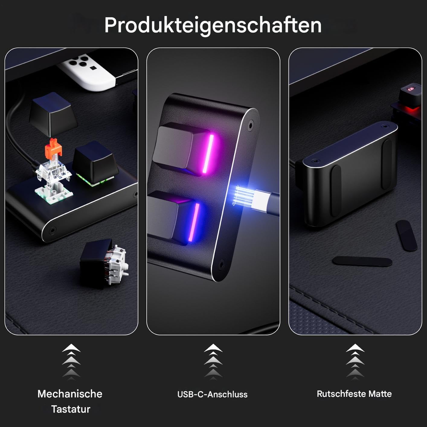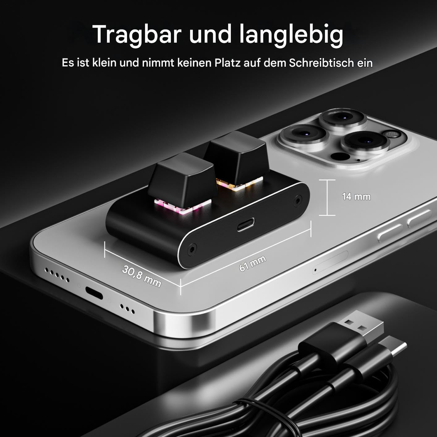 UNIVERSELLE KOMPATIBILITÄT Der Macro verfügt über eine zuverlässige Kabelverbindung mit Typ-C-Anschluss, die eine mühelose Plug-and-Play-Einrichtung für verschiedene Geräte ermöglicht. Es gewährleistet eine konstante Leistung ohne Verzögerung bei der Signalübertragung, sei es für die Programmierung, die Erstellung von Inhalten oder wettbewerbsorientierte E-Sport-Umgebungen, und bietet breite Anwendungsmöglichkeiten für ein breites Spektrum an Benutzeranforderungen.