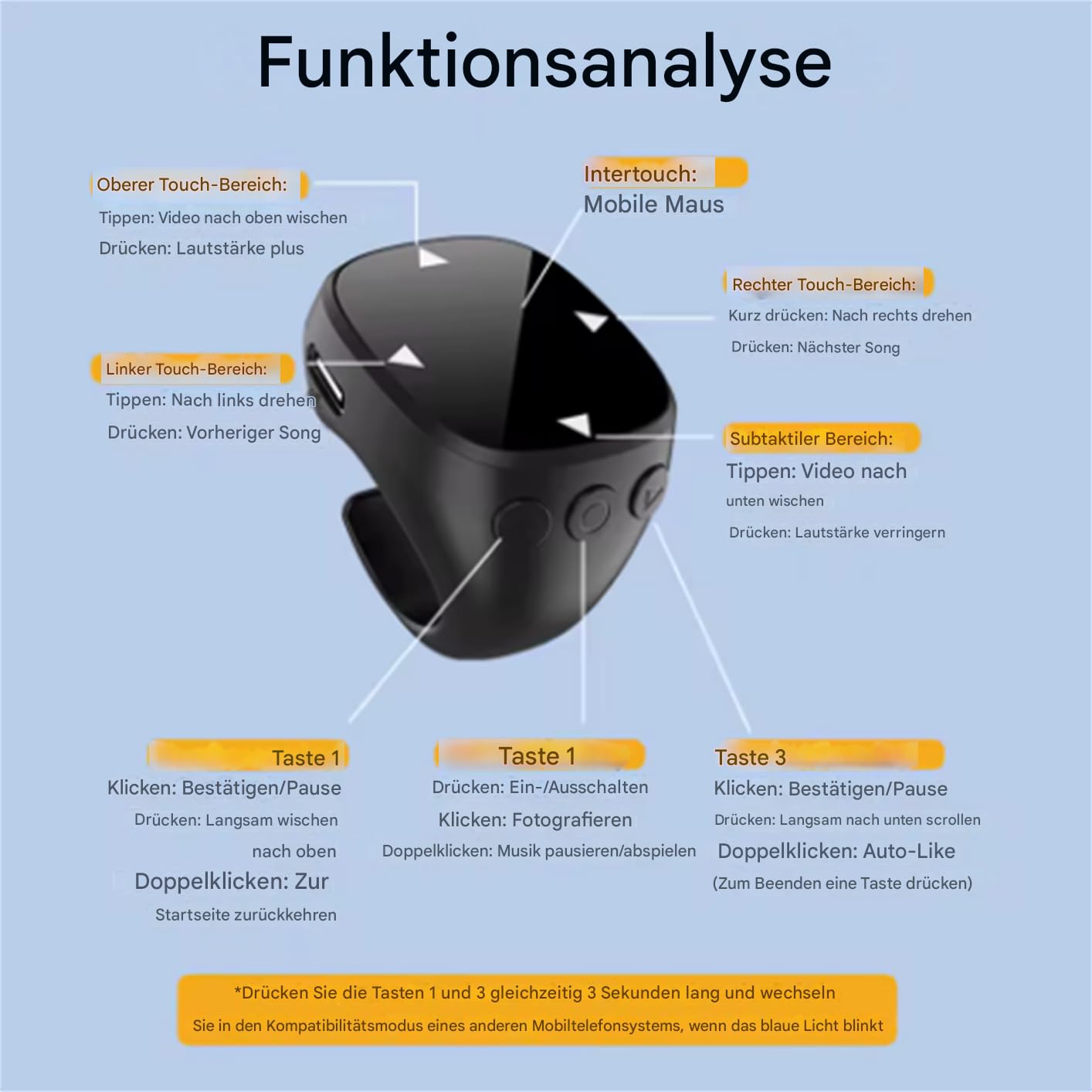 Modernisierte One-Tip-Bedienung: Der innovative Touch-Ring ermöglicht einfache, schnelle Gesten ohne Tasten – zugängliches Streaming-Zubehör für alle Benutzer.
