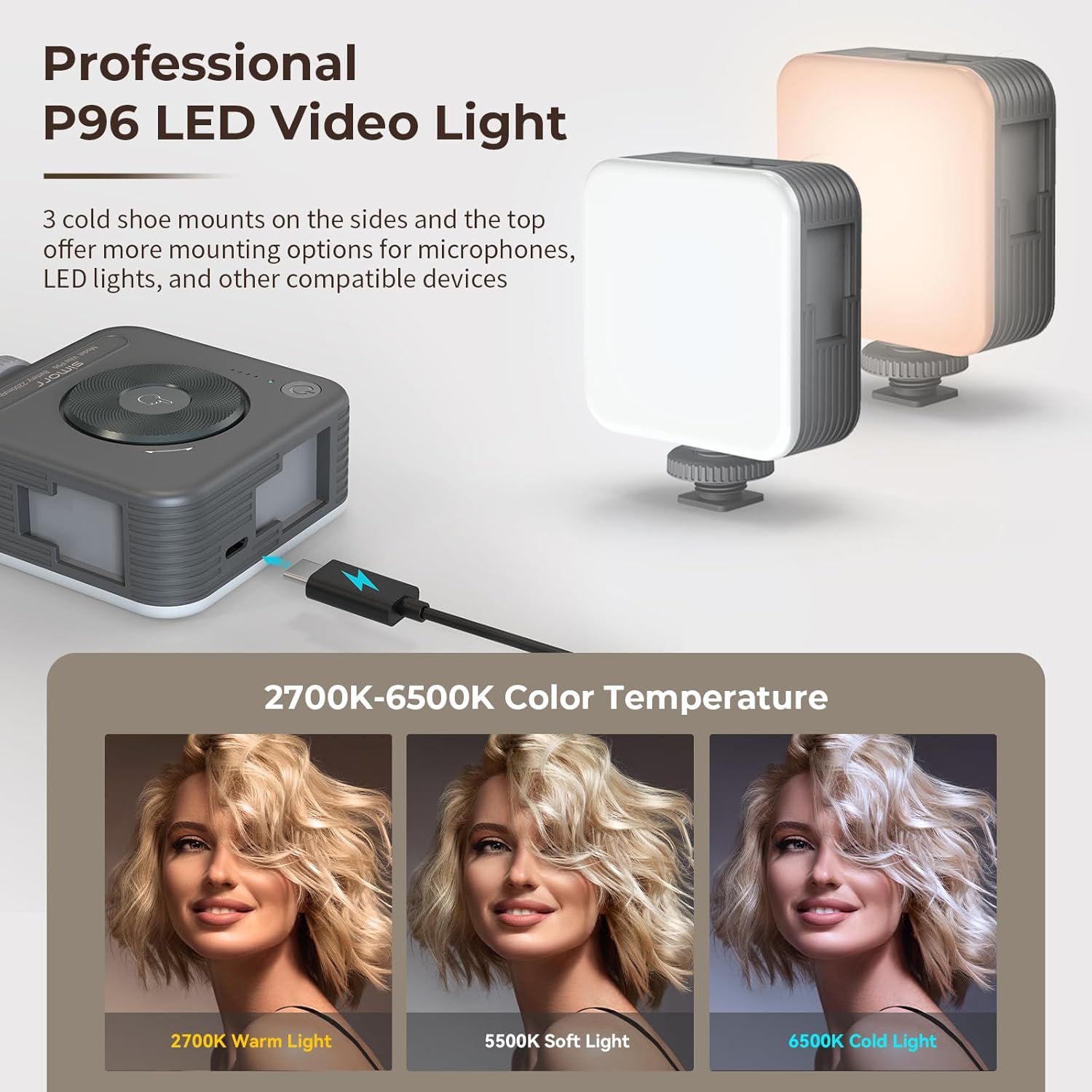 【LED-Licht】 Das Video-LED-Licht ist ein leichtes, tragbares und elegantes Mini-LED-Licht mit Helligkeitsregelung von 0–100 %, CRI95 und Farbtemperaturskala von 2700 K bis 6500 K. Die Leuchte verfügt über einen eingebauten 2200-mAh-Lithium-Ionen-Akku, der über das mitgelieferte USB-Ladekabel Typ C aufgeladen wird und eine Betriebszeit von 105 Minuten bietet (maximale Helligkeit).