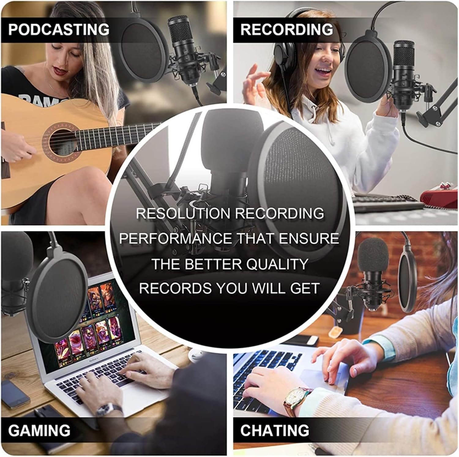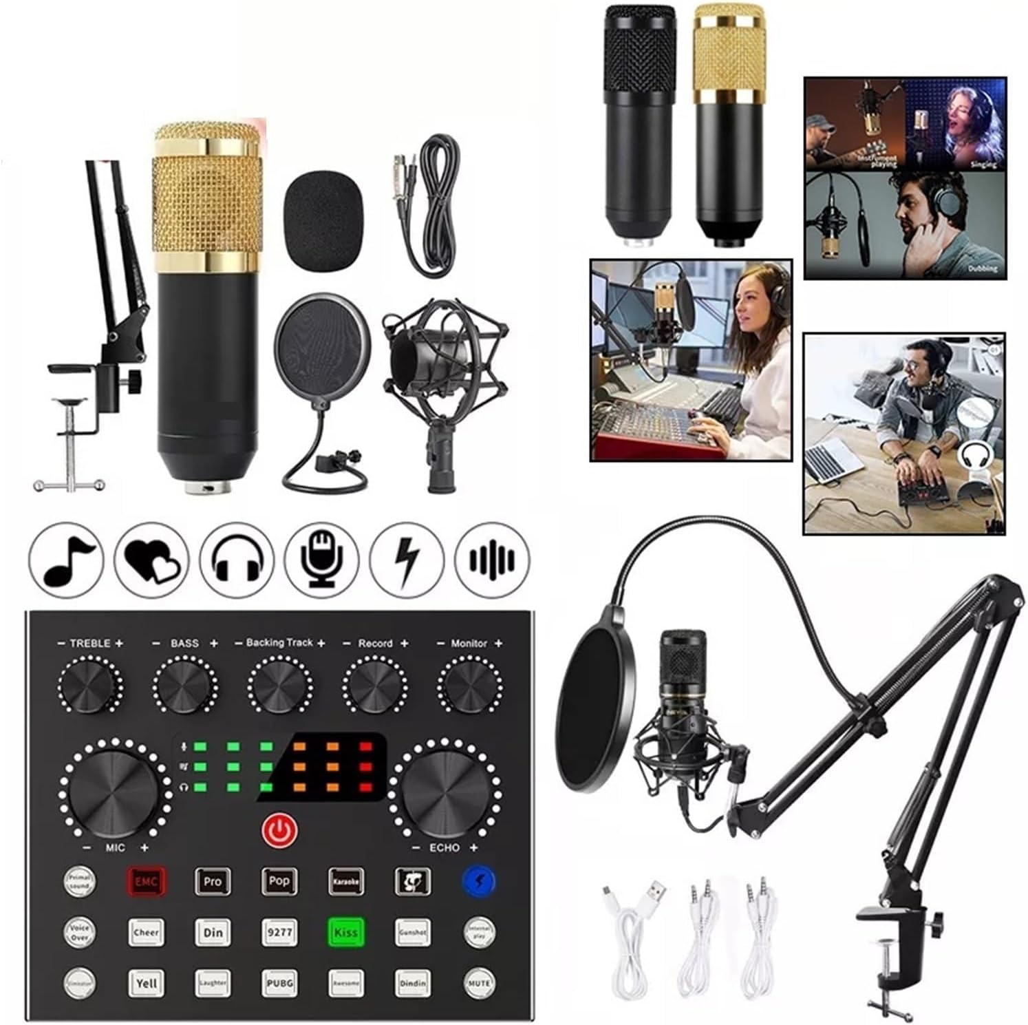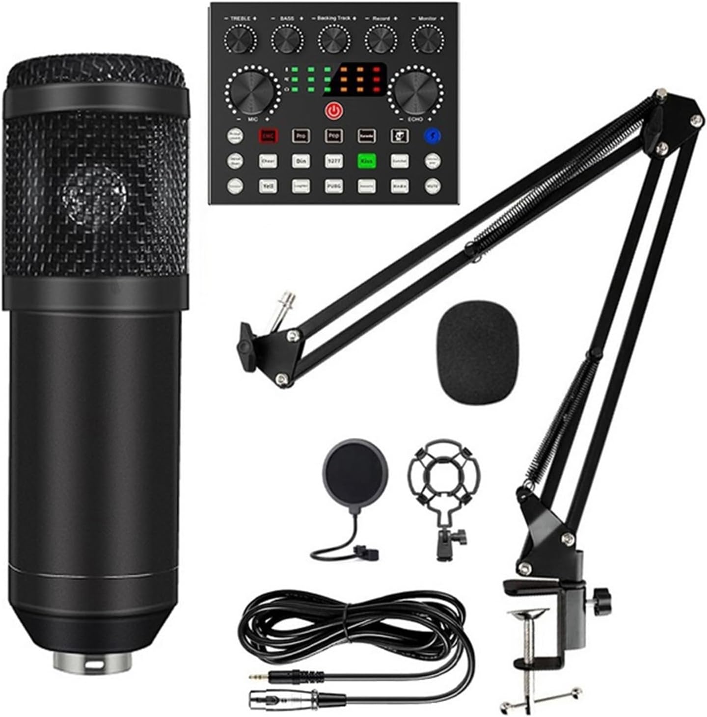 [Professional Recording Kit] Das Mikrofonpaket wird komplett mit vielen wichtigen Zubehörteilen geliefert, darunter ein Kondensatormikrofon, ein verstellbarer Scherenarmständer, eine Tischmontageklemme, eine Stoßdämpferhalterung, ein Pop-Filter, ein 3,5-mm-Stecker-zu-XLR-Buchsenkabel, ein Soundkarten-/Mikrofon-Adapter und vieles mehr.