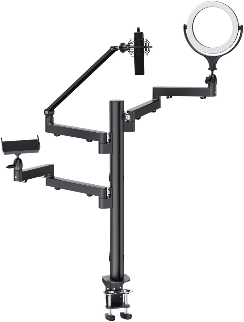 Spacetronik Live Streaming Stand Table Mount, Overhead Camera Mount, Tripod with Lamp, Microphone Arm 36 cm, Laptop/Tablet/Phone Holder, All-in-One Creator’s Mount Pro