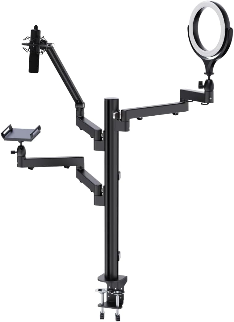 Mikrofonarm und sichere Halterungen – Der Mikrofonarm ermöglicht die Montage eines Mikrofons an einer separaten Halterung (nicht im Lieferumfang enthalten). ABS- und Silikonpads erhöhen die Stabilität der Gelenke und schützen angeschlossene Geräte. Die Halterungen für Laptop (41 cm), Tablet (25 cm) und Smartphone zentralisieren den Aufbau auf engstem Raum.