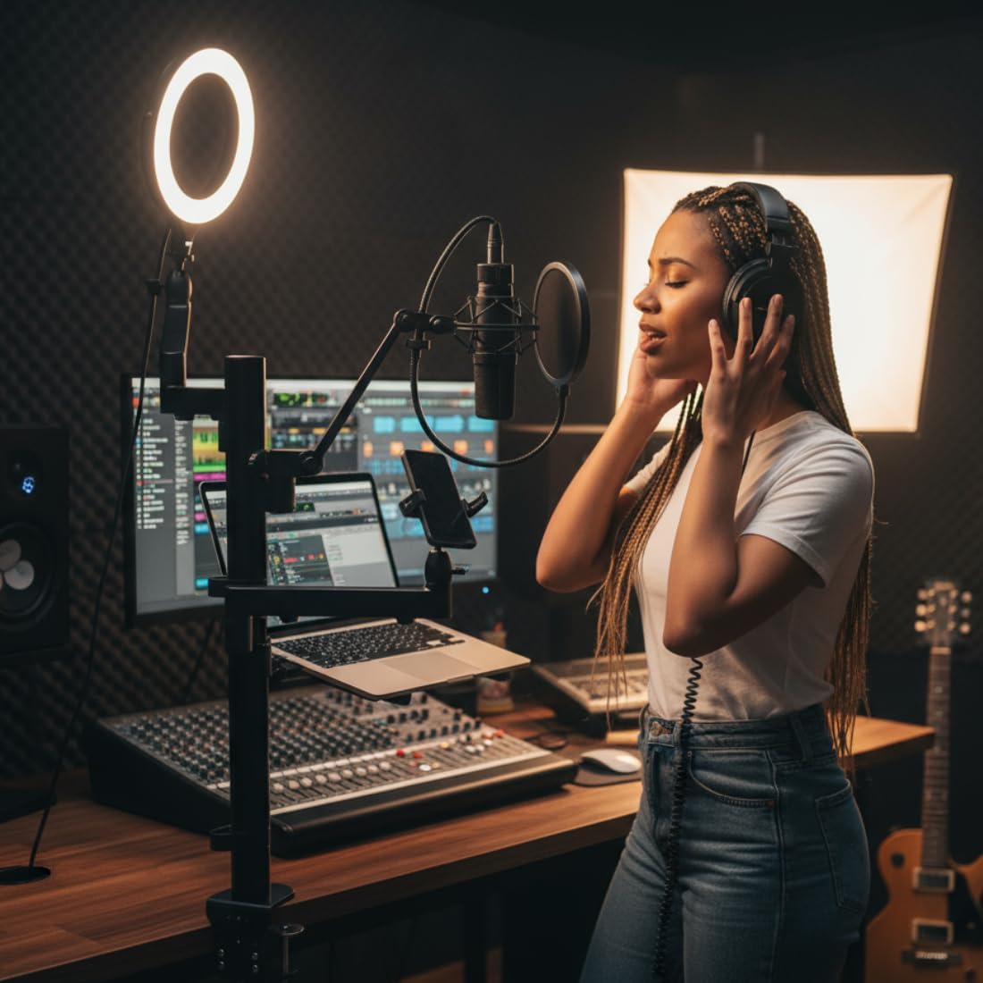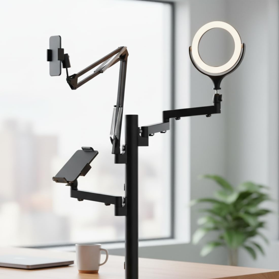 Modulares Multi-Device-Setup für Creator – Smartphone, Tablet, Laptop, Kamera und LED-Beleuchtung können gleichzeitig genutzt werden. Durch den modularen Aufbau können Sie weitere Arme, Halterungen oder Zubehör hinzufügen, sodass das System mit den Anforderungen des Studios wächst.