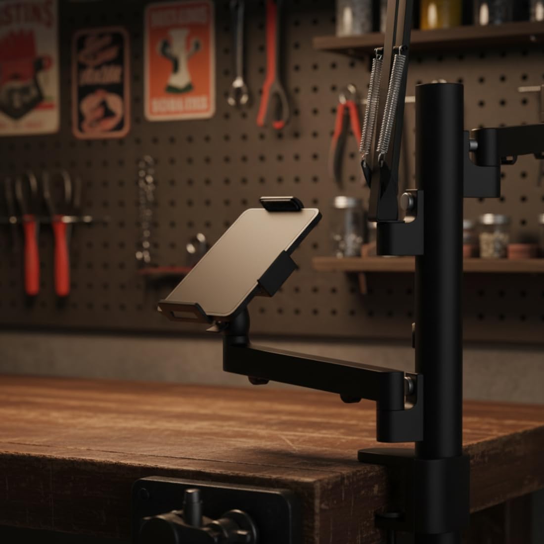 Ein zentraler Befestigungspunkt schafft Platz für Requisiten, Tastatur, Audio-Mixer oder Bedienfeld. Mikrofonarm, Tablet- und Smartphonehalterungen sowie die Lampe sorgen für ein aufgeräumtes Umfeld, das Konzentration und vorhersehbare Ergebnisse unterstützt.