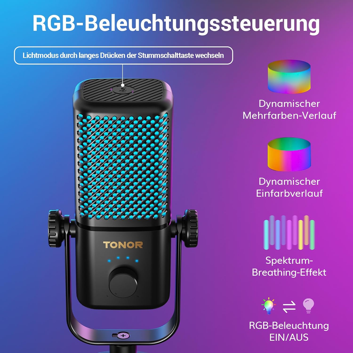 RGB Lighting Effects Design your gaming environment with three dynamic RGB modes. Activate it by long pressing the mute button and switch between modes with a short press. For a puristic gaming experience, you can also turn off the lighting completely