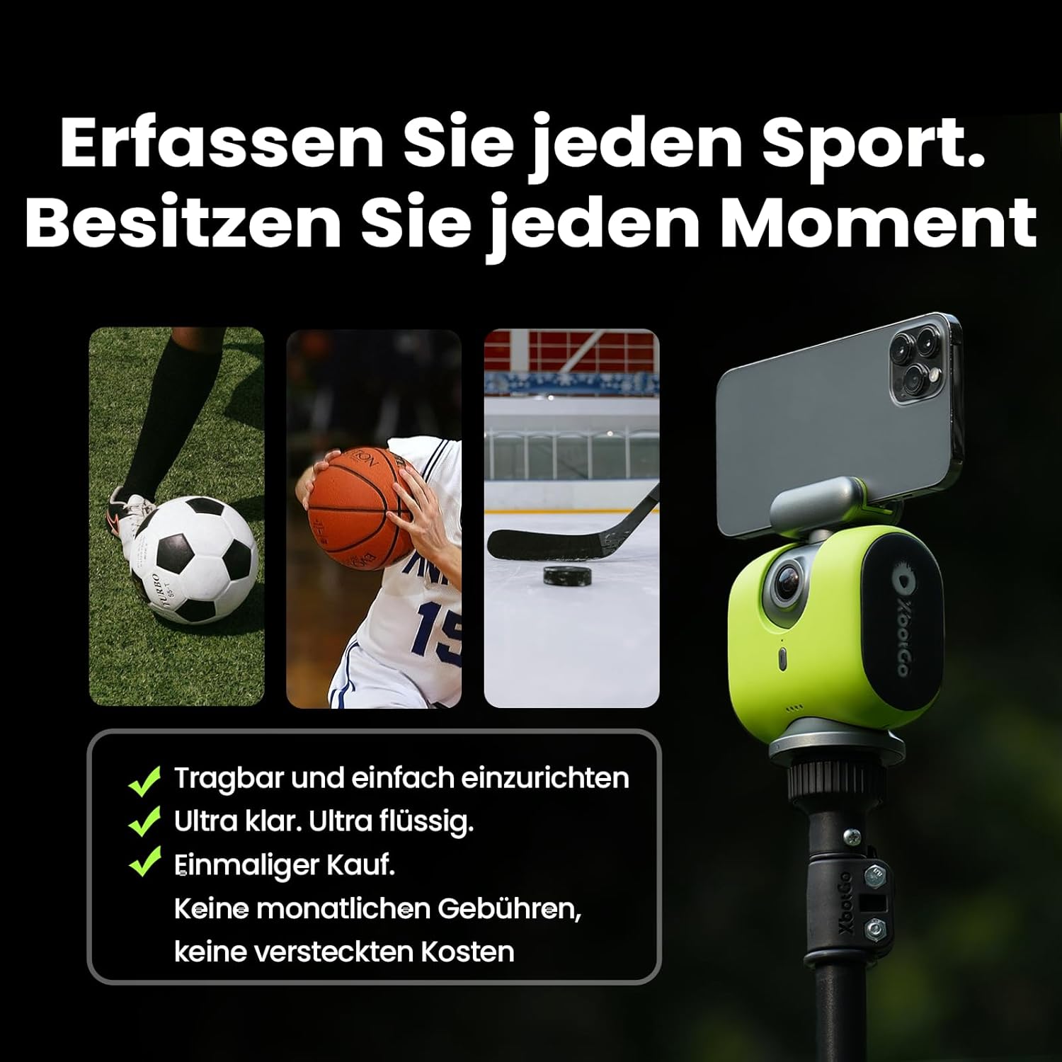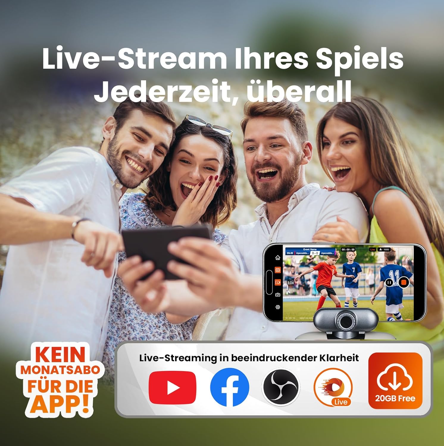 Live-Streaming und Teilen: Streamen Sie Spiele in Echtzeit mit der Sportkamera und teilen Sie sie direkt auf der XbotGo-App, YouTube, Facebook oder einer anderen RTMP-kompatiblen Plattform. Genießen Sie reibungsloses Live-Streaming mit Familie, Freunden und Fans – egal wo sie sind.